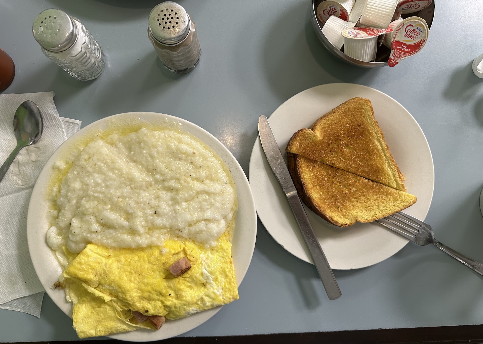 5 Jun ‘24 10:30 $30.24 + tip for two coffees, two Western Omelettes both with grits and toast, I added jalapeños to my omelette. The coffee was really good and strong just the way I like it. Plenty of cream and sugar, butter, and jelly on the table. The omelettes were both a tad undercooked inside as both omelettes had some runny egg whites. The grits were hot, thick, creamy, and delicious, not the least bit grainy like most breakfast restaurants these days. The toast was perfectly crunchy and buttery. The salt and pepper shakers were clean. One lady on the grill cranking out the food and doing an impressive job. One server did a good job taking care of all the customers. Crowded little hall that led to bathroom. The whole place could use a serious deep cleaning. The windows and door were both greasy dirty. My booth seat had a chunk of something stuck to it. The server doesn’t give you a ticket/bill, she just tells you...