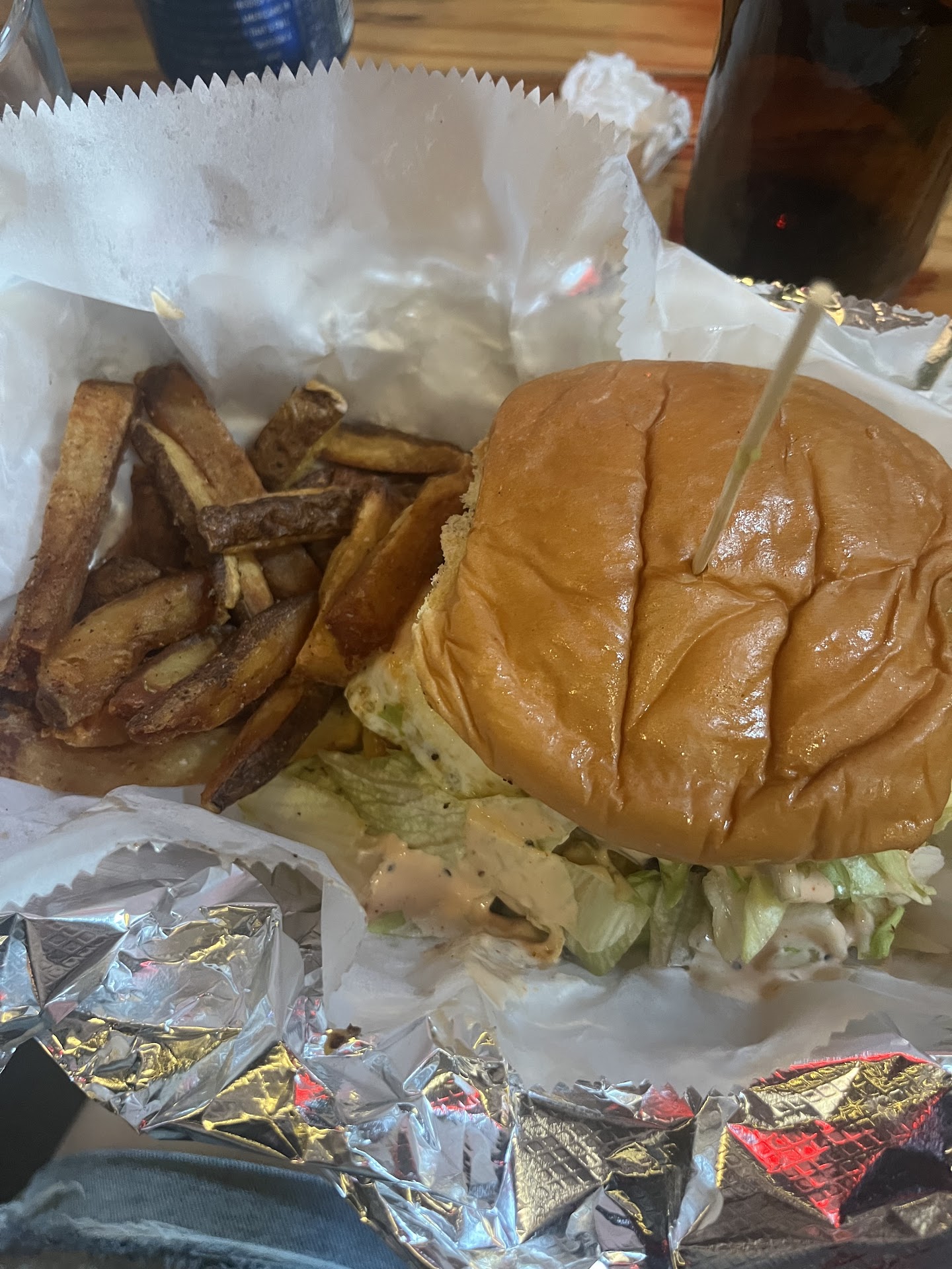 Straight to the point this is one of the best burgers I have ever had in my life. The fries are NOT generic but delicious. Over Yonder is more of a bar rather than a restaurant, at least that is what I was told when I couldn’t add bacon (of course assuming an extra cost) or remove egg from the deluxe that came with bacon (I really wanted bacon and maybe bbq (didn’t have either) on my burger as i get my burger the same everywhere). An odd policy though I trusted the kind bartender and just got the classic. Had to order at the bar as no traditional server is there. Still I didn’t mind with the food being amazing. Napkins and condiments already at the table. Atmosphere is lovely and I can see the potential in a fun night. Finally, as someone from Texas who legitimately hates country music (modern at least) with a passion, I bless the playlist or whoever was on aux for providing...