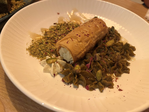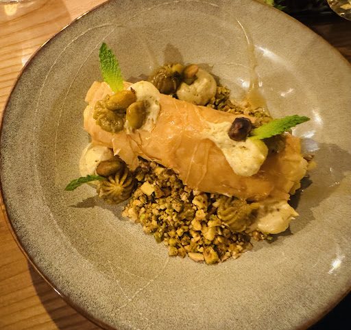 Dessert was a showstopper — a delicate baklava roll filled with cream, sprinkled with pistachios, surrounded by a gorgeous pistachio crumble. Sweet, crunchy, creamy, and totally unique.