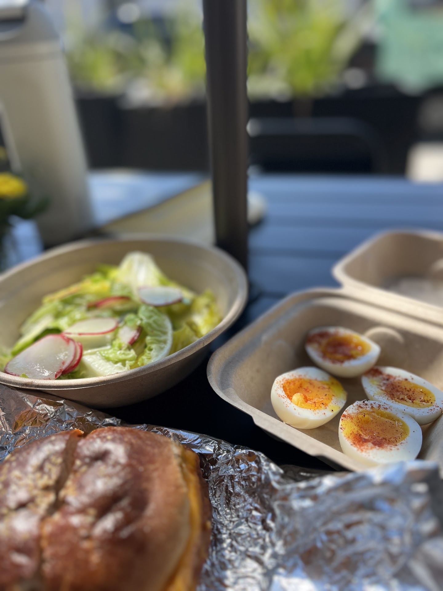 That said, the food just didnât hit for me. Everything came in takeout containers, which felt unnecessarily wasteful. The jammy eggs were served fridge-cold (which Iâve only ever experienced with deviled eggs), and my breakfast sandwich was frustrating to eatâthe wrapper stuck to the cheese, so I had to pick pieces of paper off my food. The egg custard they use was overwhelming, and despite seeing fresh baking happening, the roll didnât have that light, fresh-baked bounce.
