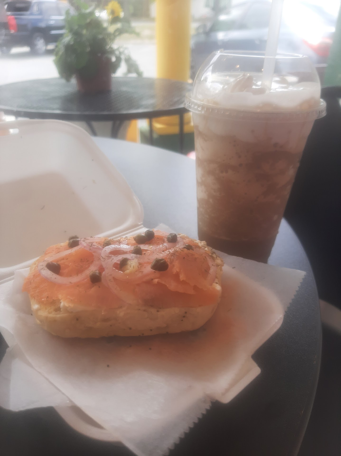 After months of meaning to try this little cafe near my home, I finally did. I ordered through GrubHub and originally requested their recommended dish, a Lox and Cream Cheese Everything Bagel with Capers and a Squeeze of Lemon, and a custom smoothie with Cherries, Strawberries, and Peaches.