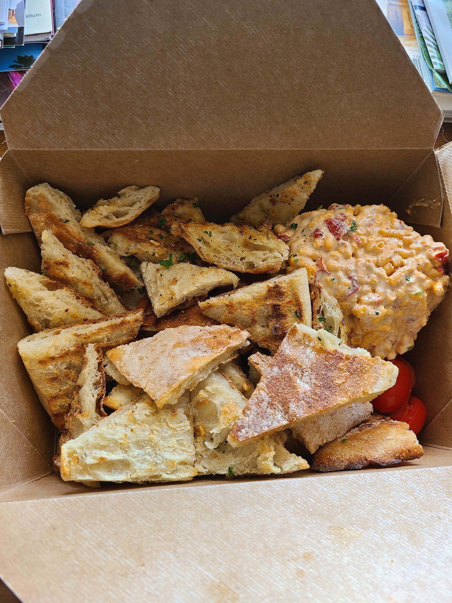 I had the pleasure of staying upstairs in the Air B&B above the cafe (wonderful apartment and beautifully furnished). For lunch, I wanted to try Pa's Pimento Cheese Plate that I saw another reviewer develop an unhealthy relationship with. She wasn't kidding! Pa's Pimento Plate and Pa's Pimento Panini (which my husband got) were both delicious. We both like home-made pimento cheese and I have to say this was the BEST that I have had anywhere. The cheese is grated into small pellets that produce a great texture and the flavors are perfect. The plate comes with fresh toasted bread that is wonderful by itself and a perfect pairing to the pimento cheese. You also get a decent portion size that could be shared by two. I was so sad to have to leave behind half a portion since I had a long drive ahead of me and couldn't take leftovers home. Seriously - it was agonizing leaving the leftovers behind it was that good!