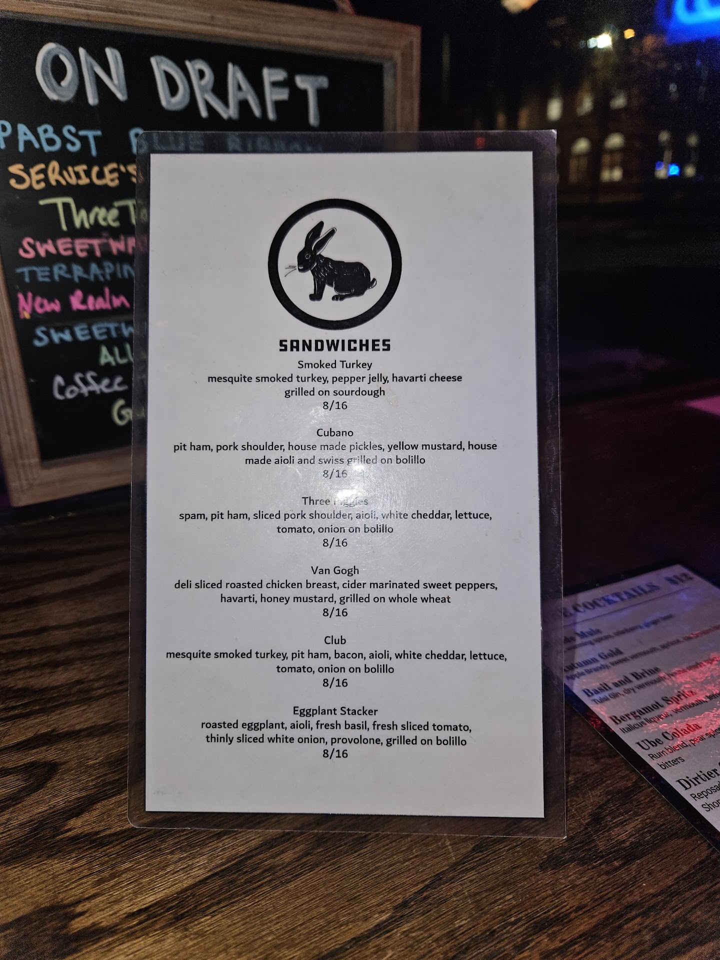 An unpretentiously deliberate exercise in the neighborhood pub-café typology, Black Rabbit situates itself at the juncture of alimentary pragmatism and curated conviviality. The spatial rhetoric favors intimacy over spectacle; the decor, absent of overdetermined design gestures, instead signals quiet competence. The sandwich-dominant menu operates within the American canonical framework but introduces modest gustatory interventions — e.g., pepper jelly with havarti, cider-marinated peppers — that achieve contrast without jeopardizing structural legibility. Libations are utilitarian rather than dramaturgical, the bar program functioning as a pragmatic adjunct to the kitchen. Service oscillates between warmly relational and mechanically transactional, contingent upon occupancy and staffing variables. In its optimal state, the Black Rabbit delivers structurally coherent sandwiches, balanced flavor architectures, and an atmosphere conducive to habitual patronage. Those seeking culinary avant-gardism will find its ambitions conservative, yet therein lies its sustainability: an establishment that privileges reliability over spectacle in a city otherwise...