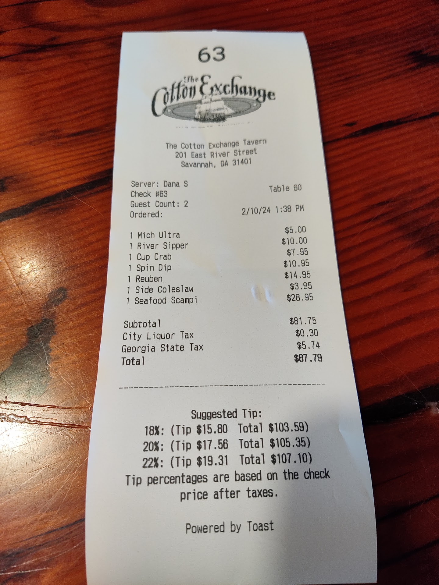 Overall, The Cotton Exchange Tavern Restaurant is a great place to go for a delicious and unique dining experience. The food is excellent, the atmosphere is stunning, and the service is top-notch. I highly recommend checking it out if you're visiting Savannah.
