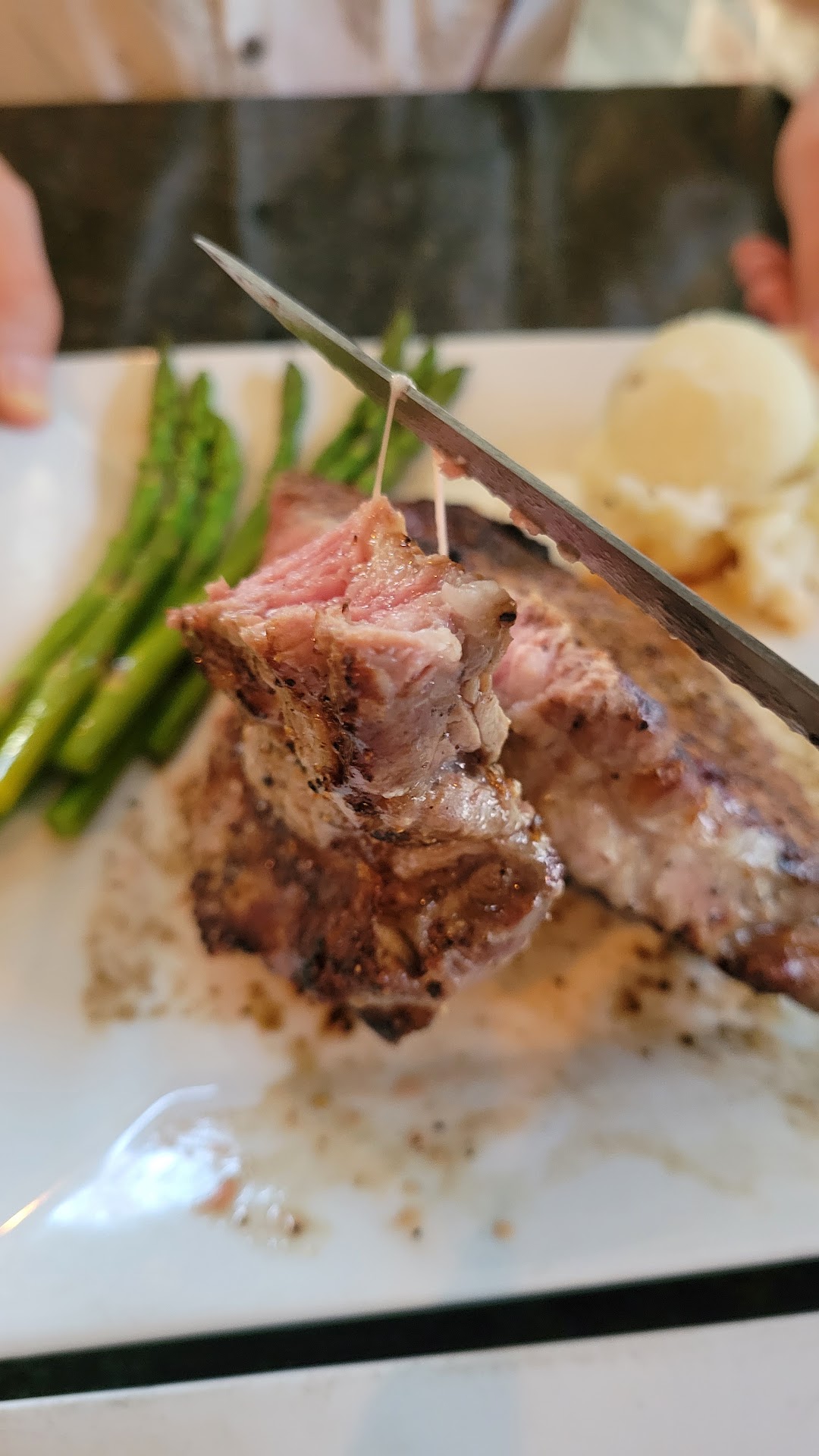 It was my first time here. I made a reservation for 4 people. As my daughter and I walked in, I was greeted by the host. She confirmed my reservation, went to the bar and asked where are the other 2 individuals. I informed her "they are in the parking lot" she then told me she couldn't seat us unless we are all together? I asked "why, because that doesn't make any logical sense?" She informed me "It's easier on the waiter, you also need to wait at the lobby". Confused by this nonsense, I decided to go to the lobby. The lobby was like an oven since it didn't had AC. You already know... the tone for a disaster has been set. I wanted to leave but everyone was hungry and wanted to try their food. The waiter was friendly. We order the Fried Bacon to start and a couple of drinks. Tbh the Cotton Candy drink is amazing. Once we got the fried bacon it was two strips cut in half slightly thicker than the thick bacon you can buy at Sam's club. It tasted like bacon with a little sweetness, not worth the price. After the bacon, the bread arrive and it was fresh and delicious. Then we order the food. It was 1 M.rare Lamb Chop, 1 M.Rare NY, 1 M.Well fillet and chicken Alfredo. The lamb chop was more of a medium to medium well. The NY was a medium. The Fillet was a medium. The Alfredo was bland. My son had the lamb, he didn't care because he was hungry so he ate it. My daughter had the Alfredo, we added salt. My wife had the fillet, she ate some of it, took the rest home to re-heat it. She also had the mash potatoes that lacked flavor. I had the NY, and I usually don't complain about stuff like this, but I honestly sent it back due to the price and I was already moody cause of that dumb policy that makes little to no sense. Again, the waiter was great so we took care of him.