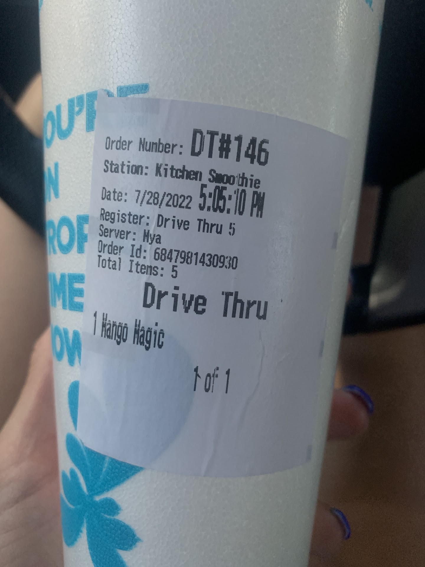I usually order online from this location and get the sausage, egg, and cheese quesadilla with a Peanut Paradise smoothie with whey. On January 31, 2025 around 6:30pm, I placed my order as usual and went through the drive-thru to pick it up. Before pulling up, I looked through the windows to ensure staff were inside. I saw a shift lead sitting by the smoothie area, drinking a smoothie and eating a wrap, which made me assume she was on her break. There was also one other employee making smoothies, so I figured it was fine to proceed.