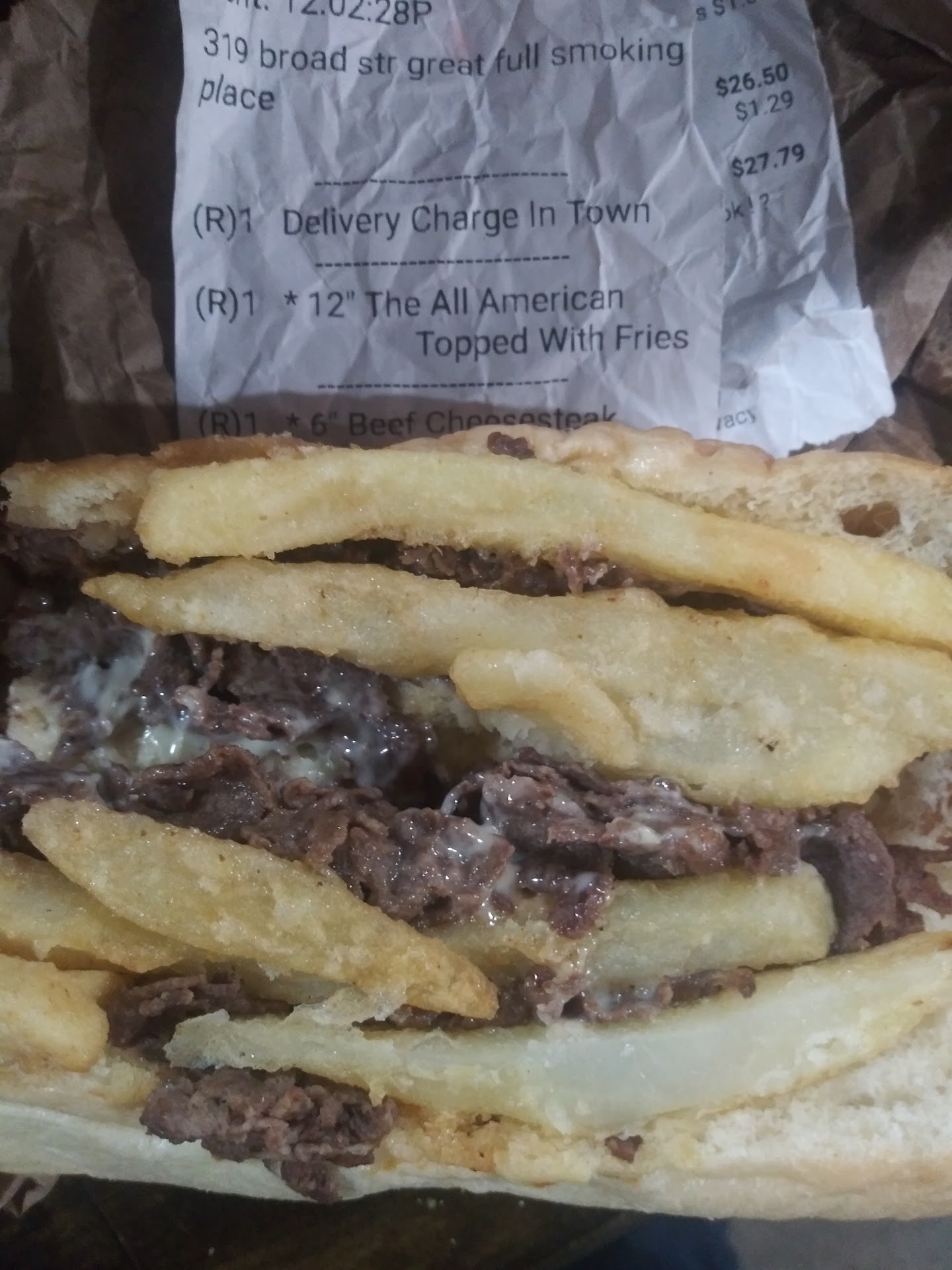 Read moreI'm going to have to try again. Just to give it a honest chance. I had already eaten so I stuck it in the Refrigerator. Upon opening it was dried out. Removed meat from sandwich and warmed it in the toaster oven. Put bread in for a minute. The results were bad. Meat all dried out with little or no cheese. None on tin foil so it didn't melt off. No onions or anything else. Ill have to ask next time. Lesson is. Eat right away. Doesn't last well in refrigerator. Service was good. 10 minute wait.