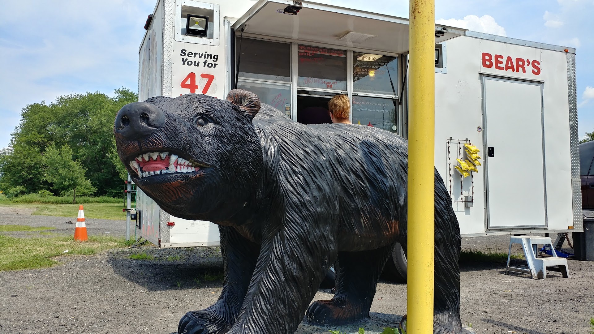 This is hands down, one of the best hot dog trucks, imho. Placed on a gravel area on the side of the road, this hot dog truck is marked by the big bear statue in front of the truck.. Passed down generationally, the son, whom is now the owner, is a great combination of friendly, professional and personable. The HOT DOGS (“dirty dogs” to some) ARE AMAZING. At a very reasonable price with your choice of toppings, these hot dogs are worth the trip. The whole experience is nostalgic, having gone with family to get a good sloppy hot dog from a generational truck vendor who passed his truck onto his son. And at that time, they were the best hot dogs around. This one is just as good. A very, very rare treat. But the picture says it all. It’s a...