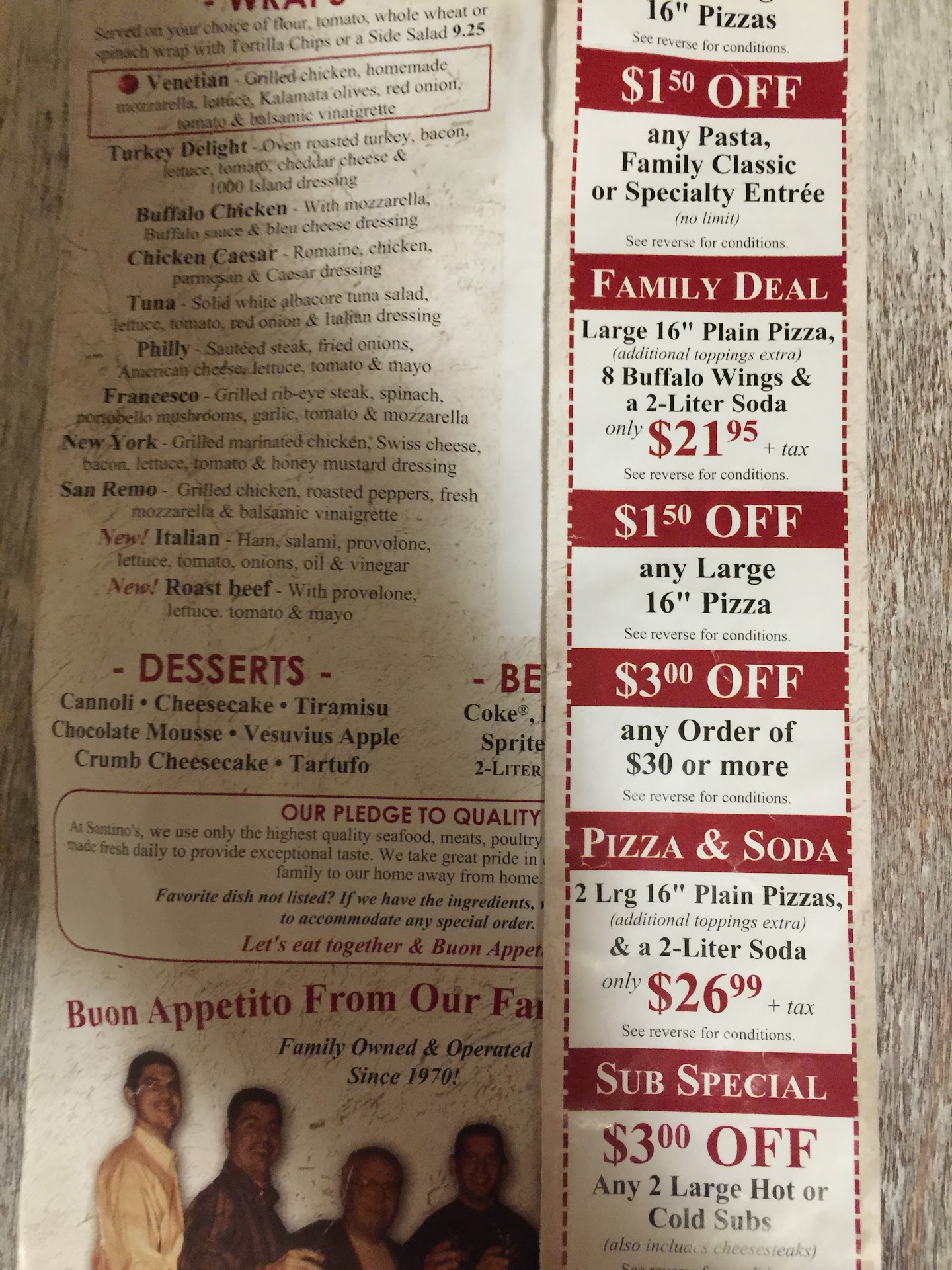 Ā Ā Ā Read moreLov it here mangia my family has been going all my life since I was a kid. Been loyal customers through everything 2 fires covid eveytime they closed we always came back.. hope they never close.. Bring back xlarge pizza .wish it was open 11 pm every nite . Lol. Everything is gud here soup salad chicken parm the best. Pasta bolonese is great š hot antipasta lov shrimp oregano great sausage sauce meatballs subs . I think mussels only thing I didn't like. Lasagna gud. Wld lov a tour of Italy or best of Santino s 3 things lasagna chicken parm stuffed shells eggplant parm all gud. Need garlic bread again. Lov cannoli.wld lov stuffed pizza. Or salad bar. Family meals. Gelato. More fish. Lobster crab cakes frutti dimare.wld lov that. Or more regional Italian it's mostly great southern Italian food . Prices went up a bit but still gud. Wish they had tv more seating. Gud delivery. U can't miss at Santinos it has everything u need great pizza pasta and dinner classics . Sauces r great. It brings back memories of family Italian food from around the neighborhood u just can't beat it. I cld never forget Santinos restaurant we hav loved it for yrs and always reminisce about the pizza everywhere we go we compare it to Santinos. Lol.when I go to other states u can't get gud Italian food or pizza believe it or not. I missed nj Italian food the best. It's a nj thing we all eat Italian food and make it at home . Italian food brings family together u eat u laugh and u lov. Santinos will always be...