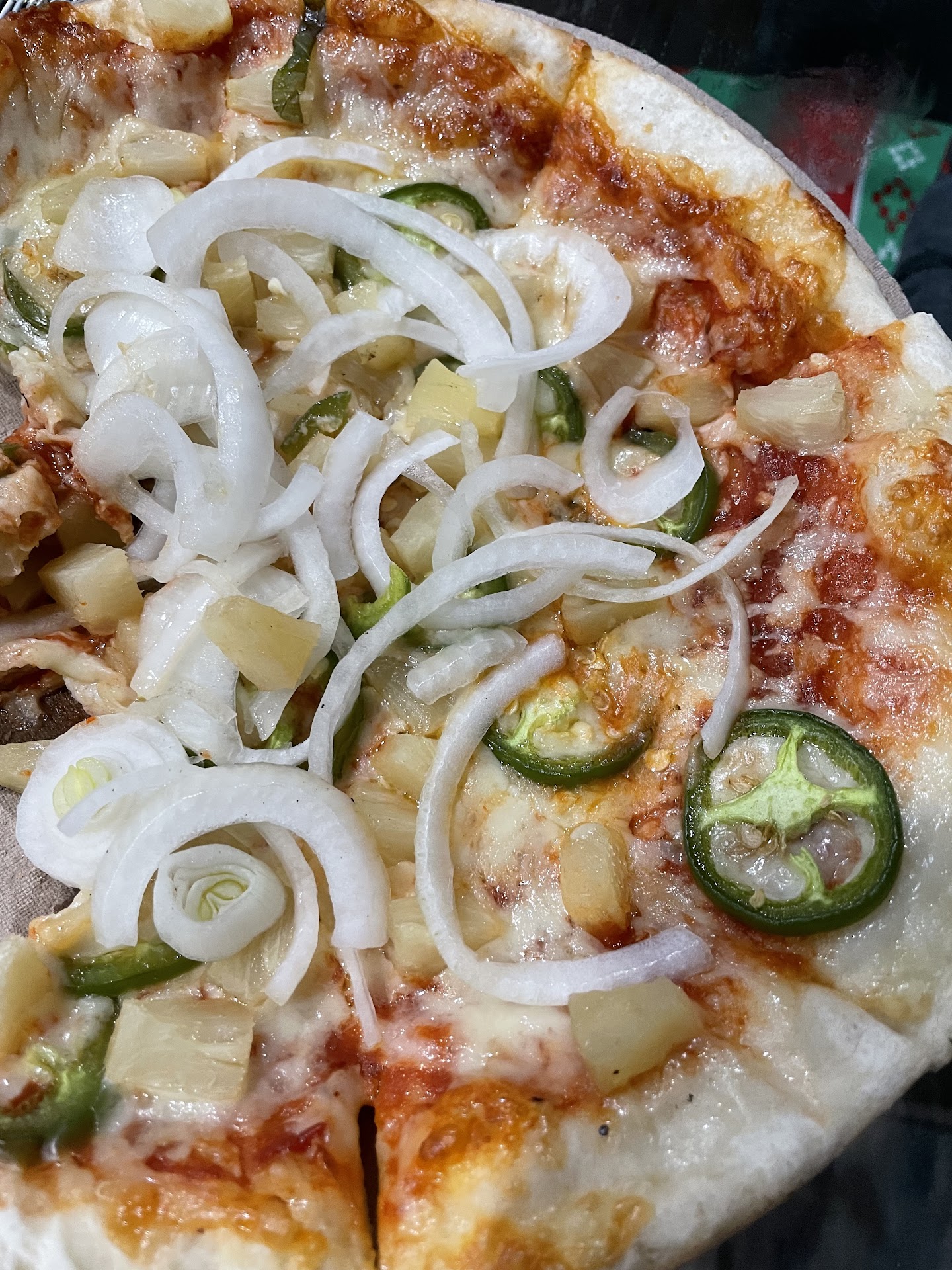 An Indian friend who knows that I like a taste of the exotic recommended that I try Indian-style Pizza. Now before somebody suggests that it is a ridiculous idea to have Indian pizza rather than Italian, I should point out that nearly every country that has adopted pizza has their own touches for making it. The Scots seem to like ham and pineapple pizza, though you rarely find it in the US. You do find it at Singas. I think the Greeks have a teardrop shaped pizza. By the way the Baltic Republics have excellent herring pizza. I like things exotic.