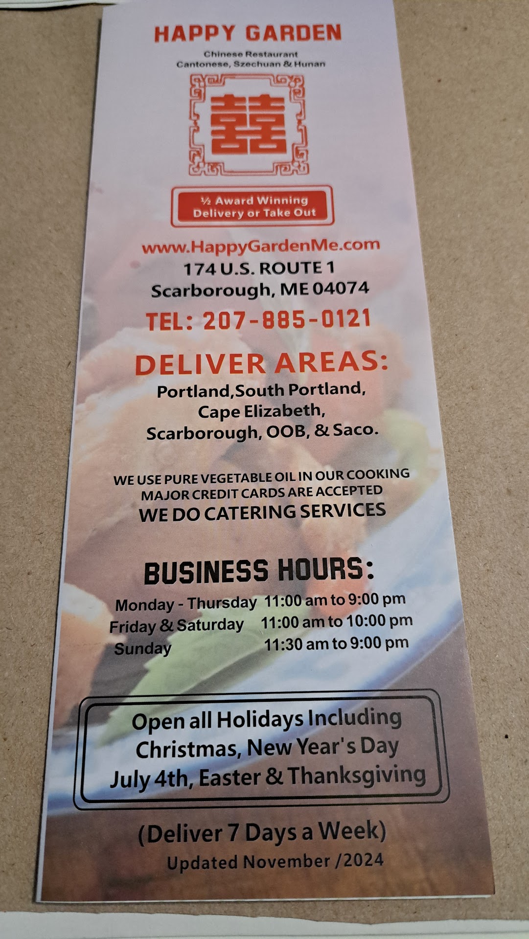 Read moreHappy Garden used to be one of my favorite restaurants but it no longer will be. I refuse to order from them again. The new owner is rude, disrespectful, condescending, and very unprofessional. He lacks customer service skills. The front doesn't know how to take proper food orders. The owner argued with me for over 20 minutes over a large duck sauce that I had originally ordered but was never charged for because the person who took my order didn't listen He continuously laughed at me throughout this conversation and threatened to not deliver here again over a LARGE DUCK SAUCE. He then said he would give it to me but WE had to go pick it up or they would charge us another delivery fee to bring it back to the house. Long story short I will never be ordering from them again. Never going to reccomend this place to...