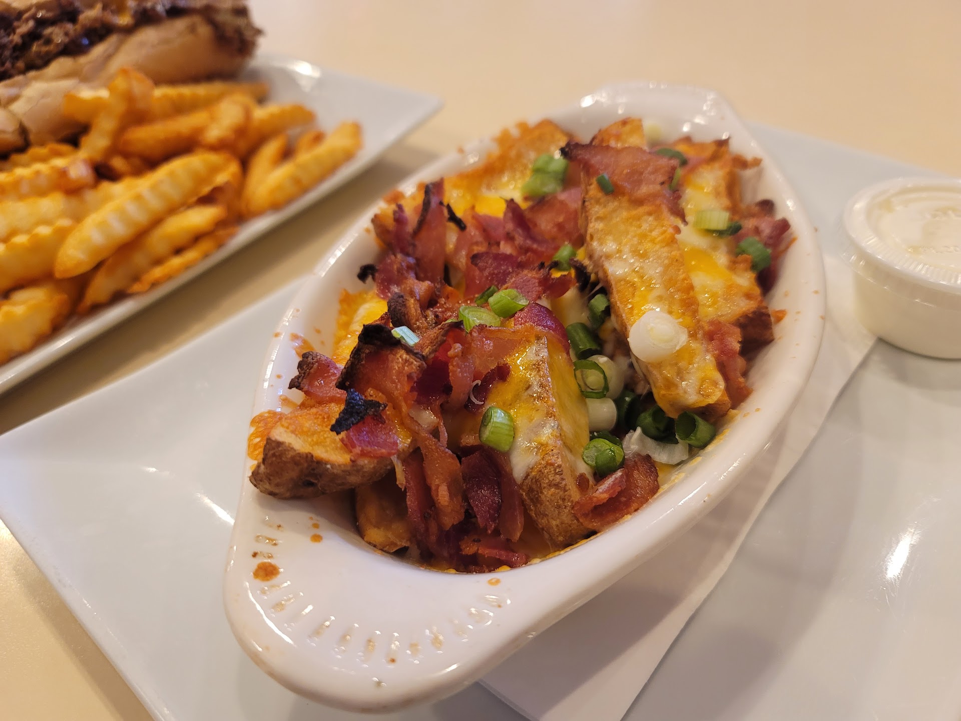 Eight of us showed up and chose the table under the awning in the back under what we found out later was the "take out" area. We really liked this spot because it was dim and much quieter than the more lively and very bright bar area. However, we sat a long time not knowing there was no service there. Finally I went out to seek assistance and was informed that we had to order at the take out counter there. After that it was very confusing since we all had to go up and order and then go to bar and get drinks, though we were then informed we could order drinks at the take out counter. Everyone was very friendly, very accommodating, excellent service after a mishap. I really wish you would just make all the tables part of the waited service area, all the take out tables remained empty while we were there, who orders take out and then sits at the table, it seems illogical. The food was delicious but the ordering process was crazy disorganized and detracted from our little celebratory event. If only it was all just waited tables, I think I would do another occasion there, however I would not want to sit in the noisy overly bright bar area with a party of eight and try to have conversation, give our gifts etc. Can't you just make it all one restaurant that is served by the wait staff? It's too bad, one of the waiters could have had a nice big tip. The food was very good and the beer choices were great, the prices very reasonable. Just need to fix the layout and the atmosphere (tone down the lights on the bar side). Also, we couldn't figure out which was the appropriate door to enter and exit. I guess that might be more clear now that we've been there once. If these improvements are made I will...
