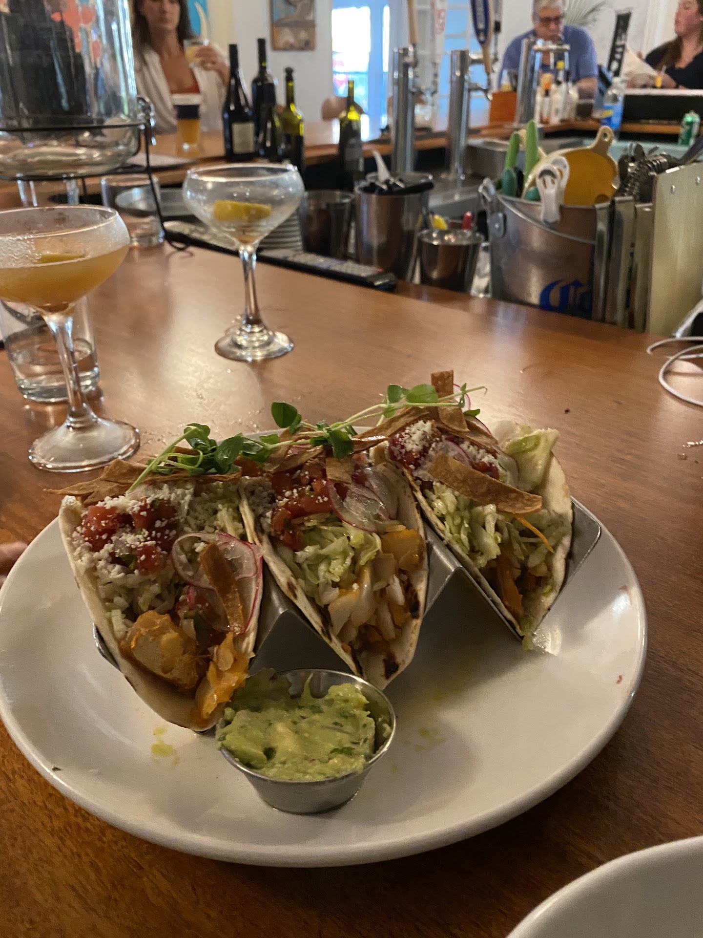 Caesar salad was ok. Fish tacos were good, except the tortilla was not even remotely done in the inside.