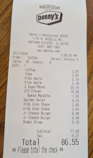 Read moreI usually don't write these reviews but this Dennys had the worst service and the worst hygiene. Our server, Maryah, was nice but not attentive. It seemed like she didnt want anything to do with us. After she served us our food, she never came back to check on us until it came time for the bill. I needed a refill but she never asked until we were ready to leave. Another waitress, didn't catch her name, was singing obnoxiously loud, dancing, fixing her hair by the food and talking about a bad smell in the back room. It was just very unprofessional. It felt like all the servers were acting like they were on their break. The table that we were sat down at was dirty both on the table top and the floor. Leftover spaghetti, French fries, cracker wrappers were all over. When it came to the food, it was your typical Dennys experience. That is the one positive feedback I can give about this...