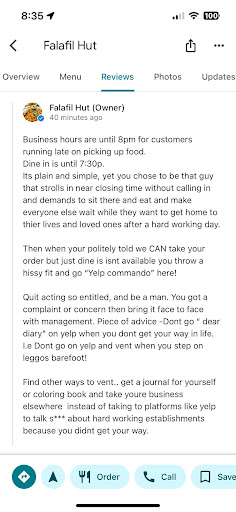 Response to the owner who replied to my review: as I said, they took my order and payment and ONLY THEN told me I can’t dine in. So what you said is factually wrong. If you have all these ridiculous nuances about your business hours, then you are not a serious establishment and regardless, you should put that information on Google and your website instead of expecting customers to “call before coming” (why on earth would anyone think to do that when it’s clearly within business hours). At the very least, put it on your front door so no one makes the mistake of stepping foot inside your restaurant just to deal with this nonsense. Better yet, just change your name to “Falafil Hut Takeout Only” to save customers the trouble since that’s what you seem to be. Instead of taking accountability, you went on a long tirade berating me for writing my honest review of your bad service. Either way, you have no right to be policing people on what they can and cannot write. All you did was make yourself look bad. Still, I wish you the best and hope that you will address these shortcomings in your service....