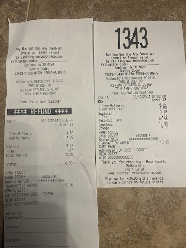 Read moreI was driving home and I thought I will surprise my granddaughter and go through the drive-through and get a couple of McFlurry’s. No big deal right? well well I order and went to the first window paid the lady go to the second window pick up the McFlurry’s, I started to drive and I noticed that on mine and the cookie powder was just on top of the McFlurry and on the other one, the M&Ms were just on top of the ice cream as well , I put my car in reverse and I asked the lady if I could speak to the manager on duty she said she was a manager and I said is this a McFlurry she goes yes! I said well isn’t it supposed to be mixed? She goes oh well the machine is not working. I said I understand that but you should’ve told me I could order something else and she just gave me a dirty look and rolled her eyes. I gave The McFlurrys back to her and I said just give me a refund , no big deal. She took my card and went to make a refund , I have a refund ticket and of course my purchase ticket, but in my account not only I do not see the refund but I see another charge for the same amount my message to management and upper management , if they cannot even make a simple McFlurry close the damn place because this is very aggravating now looks like I paid twice for something I did not get. I will appreciate if somebody can fix this, start with getting new management. Here are the photos of the transactions. again even though it shows a refund I never got a refund. I have two charges for $10.95 What’s...
