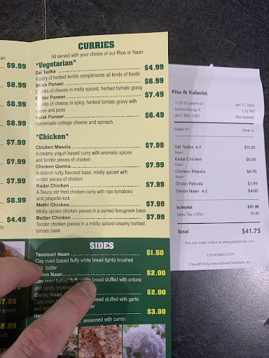 Read moreI've been looking for a new gyros place in the Schaumburg area since Zippy's closed and decided to give this one a shot. My family ordered three different pita sandwiches: gyros, shish kebab, and chicken shawarma. All three came with cucumbers and onions inside; the gyros also came with a yogurt/cucumber sauce.