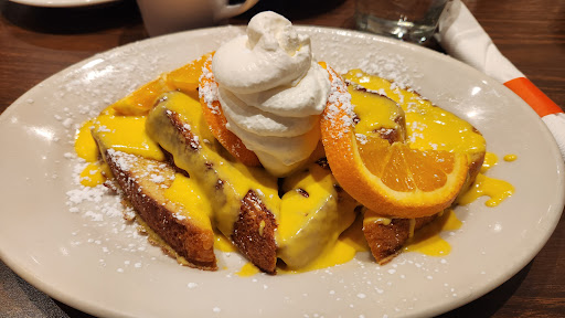 Read moreI'm so glad we stopped here for breakfast! We ate here during a busy Saturday breakfast rush, but we were seated immediately. From the outside, you wouldn't know that the dining room here is quite large. Our server greeted us and took our drink order within a minute of sitting down and she was back with our coffee just as fast. We had to take some time with the menu because everything sounded so good. My husband loves potato pancakes, so he ordered the potato pancake Platter. They were not like any he had had before. These were like a fried mashed potato that created a great crispy golden shell. He really liked them. I tried the Sweet Orange French Toast. It was so pretty when it came to the table! The French Toast was very good, but I don't think the orange sauce was a great match for it. Our kids didn't finish their Pancakes and Strawberries, so I added those to my plate of orange sauce and it was SO FLIPPIN GOOD! The combination of the orange sauce, strawberries, and pancakes was perfect. And before our kids got full, they said these were the best pancakes they've ever had in a restaurant, which is huge praise from our pancake lovers. Also, I have to mention that the coffee runs here are fantastic! There was a server around every few minutes to check in with a fresh pot asking if we wanted a warm up. If it's not obvious by now, I definitely recommend this place. The only very thing I didn't absolutely love was the noise. There are panels hung to help absorb some of it, but with a dining room so large, I understand that it's hard to avoid. I just wanted to mention it for those who might have sensitivities or an aversion to that kind...