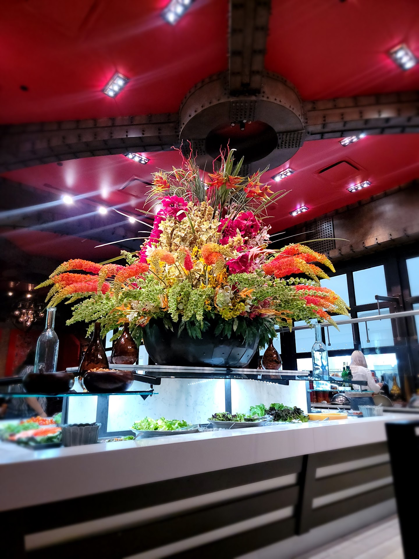 Your cardboard disc has two sides, red and green. As long as you aren't actively ready to select meat, keep the red side facing up. Get your salad bar food (all delicious, constantly being refreshed). There's a separate table with hot items - they're included with your meal, too.