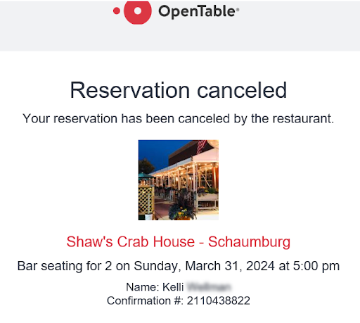 As a parting gift from Shaw's, they later cancelled our reservation on open table. We obviously get notified via the app. One last sharp and insulting reminder of how our Easter dinner started, AND how it was saved. A story I've already repeated 10 times at work just today. "How was your Easter? Have I got a story for you!"