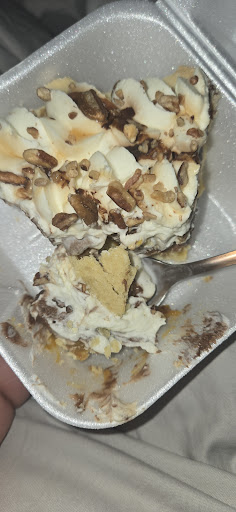 The chicken was good tender not really seasoned. It kinda taste like it's precooked and frozen not cooked fresh but I could be wrong. I love all of these ingredients but the sandwich was just mediocre to me. The fries were a bit on the crunchy side a bit over cooked imo. Wasn't offered ketchup either.. For dessert had the Caramel Pecan Silk Supreme Pie Slice $5.25 A rich and decadent pie featuring a layer of our classic French Silk, a creamy supreme filling, and a layer of caramel and Texas pecans. Topped with real whipped cream and drizzled with chocolate sauce, caramel and pecans