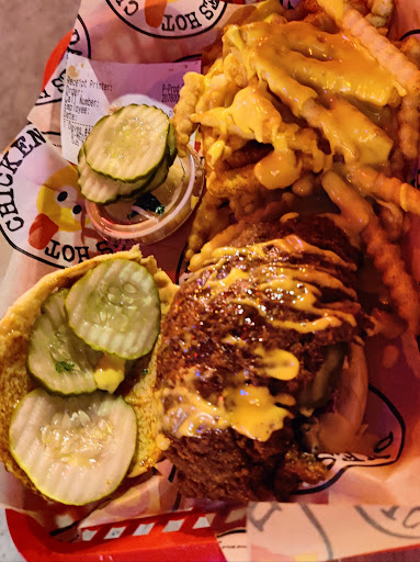 Delicious take on hot chicken sliders. Imagine chicken covered in a dry rub with a blend of herbs,spices and sugar than fried and placed On a bed of crisp slaw than drizzled with a sweet and peppery mayo all sandwiched in a buttery bun. Excellent pickles were on the side. Wife got light mild and I got medium heat..neither were hot at all and easily tolerable. Will try the regular hot next time. Both of us had cheese added to the fries that came with our meals. Food was really good and after a few beverages the cost was in line with what one would expect. Average person will likely spend about $14-$15 per person. Service was quick and the team members were friendly and courteous. I wont draw comparisons to many other Hot Chicken Coops that have popped up recently. There is room for.all as they each bring their own take on a classic.
