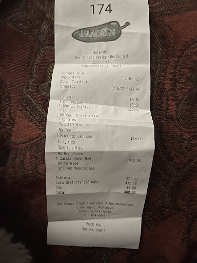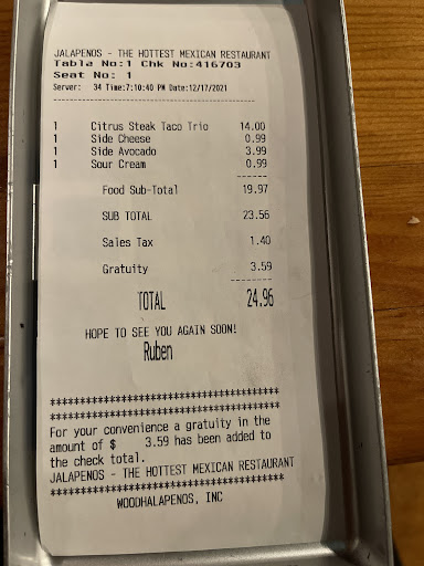 To start off, Jalapenos has always had really good food. Tastes great, hot and fresh. Weirdly enough, they might have the best french fries in the entire region, despite being a Mexican place. However, as their prices go up, their service is failing. They changed their menu and oddly removed a la carte items. My wife always ordered the same thing - two steak tacos. We went this weekend and the server refused to sell her two steak tacos. The waitress insisted that the only way to get tacos was by ordering the three taco dinner, and forced her to order a side, which is how we got to the french fries I mentioned above. My wife's margarita also came out unfrozen, just mix and tequila.
