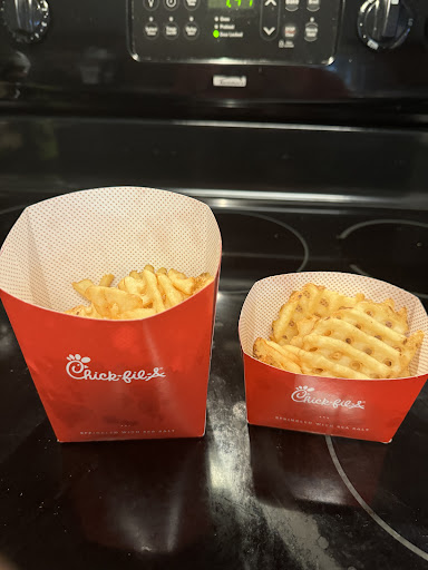 I’m going to start off by saying, the service at Chick-fil-A USED to be amazing. I order from them ALOT, multiple time a week some months… I am beyond tired of the lack of common sense and quality.i ordered a large fry and a small, got the same amount of fries in both. If you see the pics, it looks like one container has already been half eaten but no this is how I received it! What blows my mind is that someone fulfilled this order, and while filling up this fry container thought this was acceptable. I’ve had this exact same issue with the cibolo location while this location was under construction. Which makes me think whoever is in charge of all locations is telling the employees to start filling up the fries less and less, for whatever reason. Fast food is expensive nowadays and if I’m paying extra for a large, there is no reason I should be getting less than what I paid for OVER AND OVER AGAIN. I’m to the point where I’m tired of calling and complaining just for the issue to not be resolved the next time I order. They are ripping off loyal customers. Not to mention the fact that I’ve seen many people in the Facebook group complaining about the new location in cibolo and I’ve even commented telling them to just go to the schertz location, just for them to do the same. I don’t like paying hard earned money and being ripped off. This was my final...
