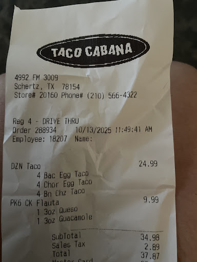 Read moreHorrible service! If I could give them zero stars I would! We ordered twice from the Schertz TX location and both times it was a terrible experience. First time ordering, we only received a little over half of the entire order of food. We called the location and supposedly spoke to a manager in which was extremely unprofessional and rude. We did end up getting the rest of the food but was roughly 45 minutes later. Second time ordering and last time, we decided to give them one more chance hoping it was just an off day for them. Roughly 60 minutes after the estimated delivery time and not getting the food, we decided to call the location to see what was going on. The "manager" said our food was ready and would be out for delivery any minute. So thinking everything was good and we'd get our food, we gave it another 45 minutes however we never got the food. So we called back up the location and was advised that our order was canceled and the food was never ready. When asking the manager about making sure that we wouldn't be charged she advised that we had to go through doordash to get our money back. This should not fall on doordash since it clearly was Taco Cabana's fault. It was extremely difficult to even understand the manager and then she hung up on us after making excuses. BEWARE OF THIS LOCATION.... VERY DISSATISFIED WITH THE CUSTOMER SERVICE AND CANNOT BELIEVE THIS LOCATION IS...