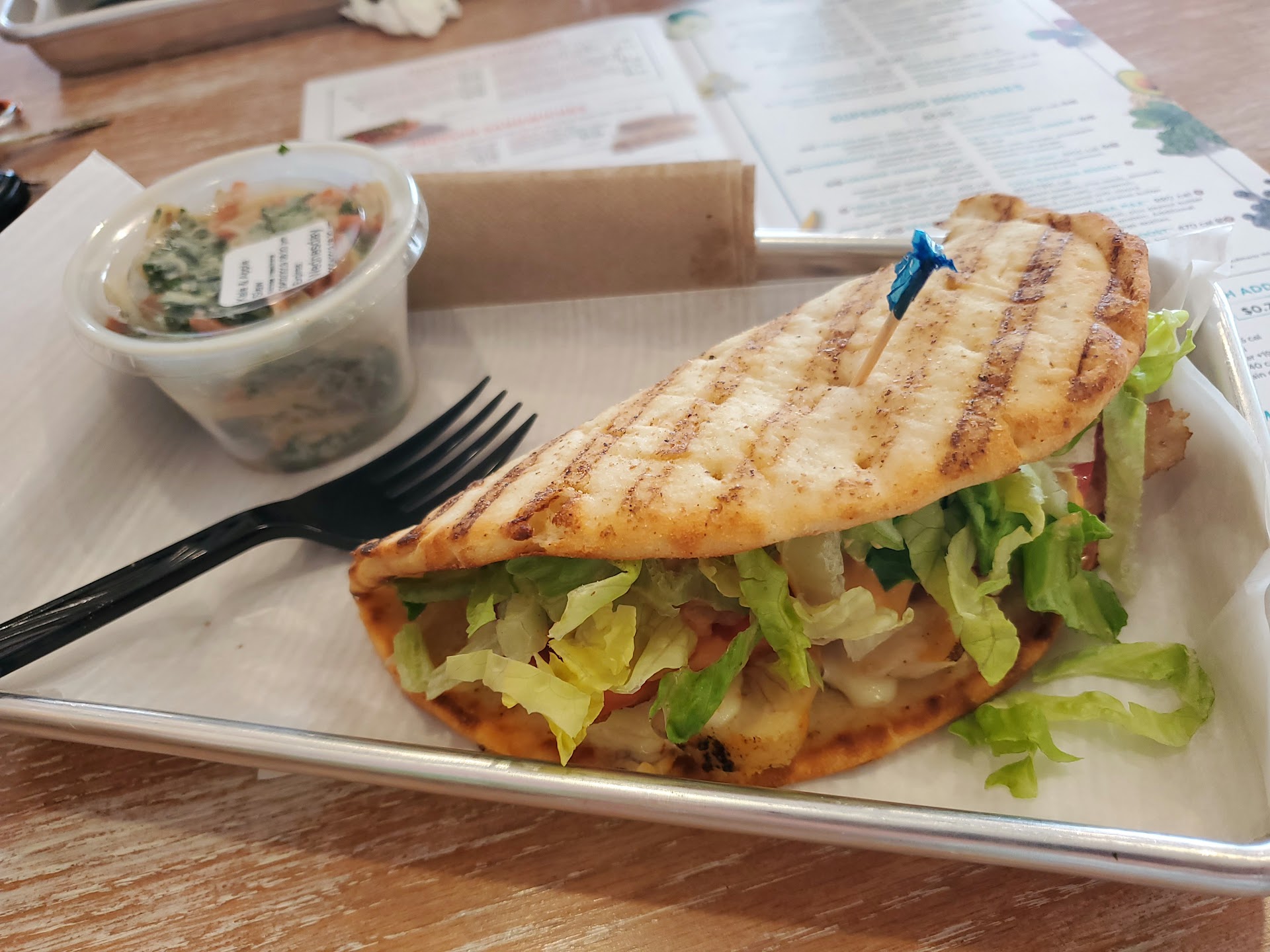 Wow. This was tasty. I tried the Detox Island Green smoothie. It is naturally sweetened and low in calories. It has kale, spinach, mango, pineapple, and ginger. If you could put "fresh" in a cup, this is what I would imagine it would taste like. I really loved it. I am still marveling at the low calorie. Their menu says 180 calories, but the size of the cup is quite large. It looks like 24 oz. Surely you jest?! Anyhoo. This was delicious with a capital D. I also tried the Thai chicken wrap. This was also delicious. It came to me in a warm tortilla or maybe the chicken was warm. Either way it was nice. It included chicken, lettuce, and carrots. The sauce they put on this is very tasty. The tortilla tasted fresh and was soft. I got a side with my wrap. Side options include chips, jalapeno corn, slaw, glazed sweet potatoes, and whole fruit. I wish they had a drive thru window! I was greeted as soon as I walked in. Employees were very personable. This is my...