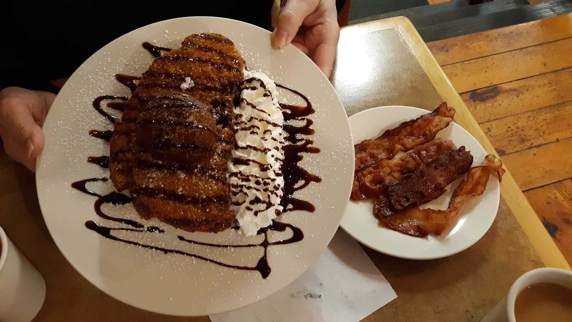 Read moreThis is a great little place for delicious homestyle breakfasts (or lunch). Check out my wife's stuffed French toast shown herein. Made with two 1" thick Challah bread pieces and finished in a crispy coating; she always goes for that! I like their 3 egg omelets especially since its cooked perfectly delicate; they don't "brown" cook them like most other diner type places do. So you don't get that brown burned taste in each bite; if you've had one like that you know what I'm saying. Great crispy (& less greasy) home fries that comes with green peppers and onion too. So many great platters here and we always remember to support our small local businesses, lest they may perish as so many have already have. Yeah, since it's small you might occasionally get a table near you that this one person doesn't use their inside voice and makes it hard to have your own quiet conversation without hearing their business. The small staff works really hard and does a great job but can get backed up quickly if overwhelmed at key times, as with any small operation. If your thing is breakfast done fast or mass produced, go to McD's or a diner as this quaint little treasure remains our "go to" place. Remember that old adage, the longer it takes the better it...