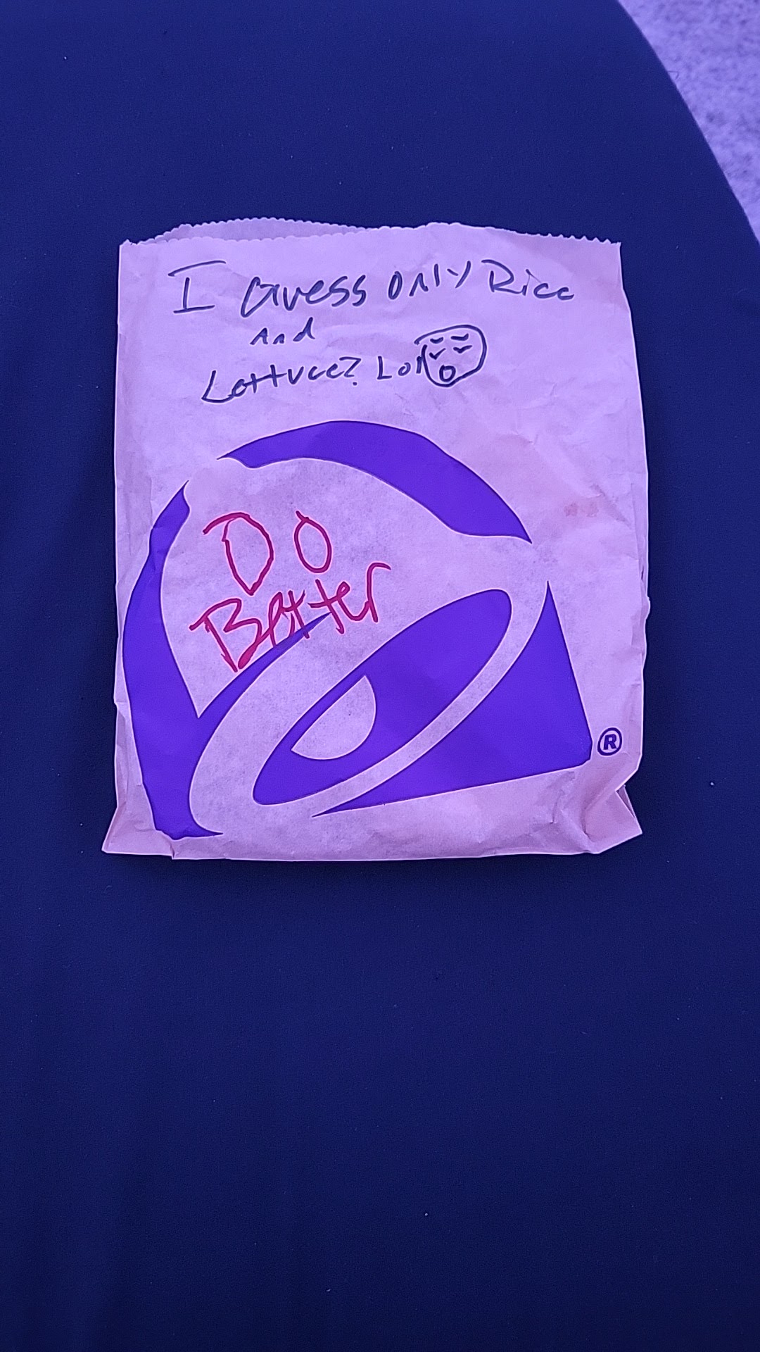 I don't know if they did this because of the tone I had when ordering but if it is you don't know what people go through in there day or what's going on in there lives. I had just got done crying was upset and needed a last minute dinner I wasn't planning on getting. I get home to relax and this happens. It sucks. I don't even know if I paid for this nasty burrito thing I...