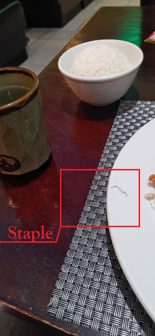 I was eating the Chicken Katsu and got some pain in my tooth. I spit out the chicken I had chewed and found a steel staple in it. They had somehow allowed a staple to end up in my breaded chicken. My tooth hasn't hurt since then, so maybe I didn't do any serious damage, but I am scared to think what would have happened if I hadn't chewed thoroughly. My waitress was very nice and apologized, but I was sort of surprised they didn't offer a discount based on the trauma of it. Remember folks: eating a staple offers the risk of gastrointestinal perforation: a life-threatening condition that is hard to diagnose and requires surgery.