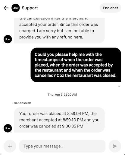 When I contacted the restaurant, they confirmed they received my immediate cancellation. Uber Eats also verified the timestamps, acknowledging that the order was placed and canceled within a minute. Yet, when Uber Eats attempted to resolve the situation, the restaurant claimed that the food had already been prepared and discarded because no one picked it up. How is it even remotely possible that a full meal was prepared in a minute?