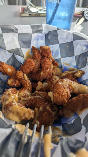I stopped here with a friend for lunch after doing some thrift/antique shopping in the area. This is your typical bar atmosphere with a low key vibe. The service was GREAT, especially for how busy the place was. We both commented on the hustle of the bartender and how she was handing a packed house by herself. The lunch portion of the chicken salad was the perfect size, we both ordered the ranch dressing which was fantastic! The onions and tomatoes were fine diced giving you the perfect bite every time! Having a choice of lettuce was a nice touch and we both opted for the spring mix. I was excited to see boom boom shrimp on the menu and chose to order that as an appetizer. I wasn't impressed as it was just small fried shrimp with boom boom sauce drizzled on the top. After eating several from the top we were left with dry mediocre shrimp. Next time I would skip the shrimp and opt for the...