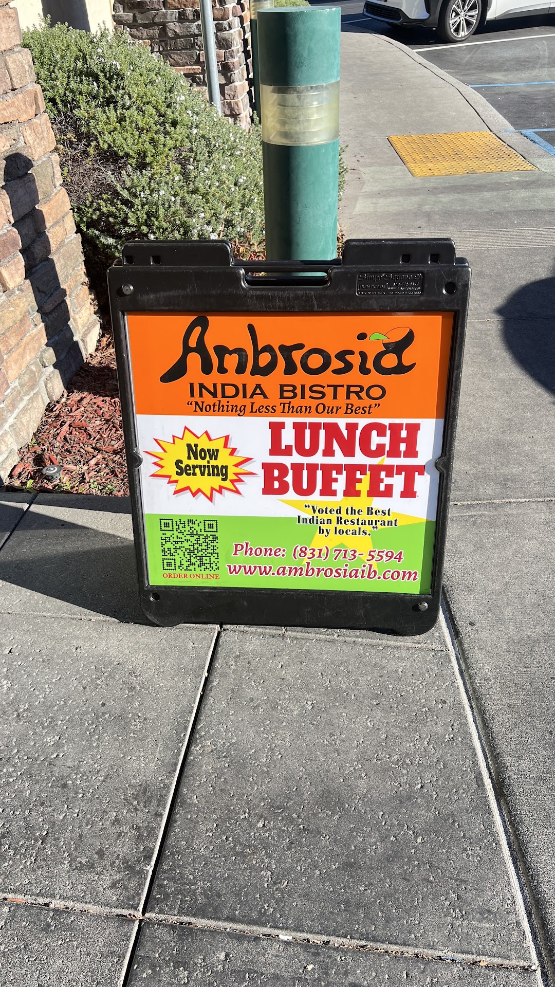 We stumbled upon this place totally unexpected, on our way to big basin we wanted to stop by for a quick lunch on a Saturday and was pleasantly surprised with a lot of things. Below is my detailed review of the place food and service: The place is super well maintained, itās spacious itās clean ,itās cozy and the warm sunlight seeping in makes it look really nice. The food was served on buffet and didnāt have a crazy lavish menu, just decent enough to satisfy your appetite, but donāt fooled at that. There is a pretty good spread, there are a good number of flavoured chutneys(pestos) that go well with the simple salad starter options. They have decent appetisers for today they had potato fritters and Grilled vegetables(Tandori vegetables). Which was super nice and absolutely non-spicy. The main course is pretty decent , it was 2 vegetarian curries ( for the day it was cauliflower and potatoes mashed and another paneer + vegetables curry) very subtly flavoured and pretty decent enough and non spicy. As for the meat based main course they have lamb and chicken( I didnāt try so donāt no comments on that š). The rice was very simple saffron flavoured rice and a mixed lentil curry. ( I WANT TO HIGHLIGHT SOMETHING ABOUT THE RICE AND THAT IS, THE RICE HAD ABSOLUTELY NO SODIUM BICARBONATE) which was huge huge blessing unlike most other places that add insane amounts of baking soda in food. The dessert was a simple mango panna kota which was nice. The breads were served on the table freshly made which was really cool. The buffet also comes a complimentary drink which ranged both alcohol and nonalcoholic. The service isnāt great they barely check on you, if you need anything at all. Itās definitely on higher price side than usually places but I guess thatās how it is. Over all the food is pretty decent and has no sodium bicarbonate( baking soda) which is good cause else it would leave you bloated for hours. The only drawback I found was even though it was a bit late, they didnāt choose to refill the buffet, which is okay but I think for the price we paid I would expect fresh refills. They have a huge banner of Gayatri Mantra (a religion Hindu holy phrase) right above the service place. Which is very thoughtful. Like taking pride in oneās religion and culture.( We really liked it) If we are ever in the area Iād love to go back...
