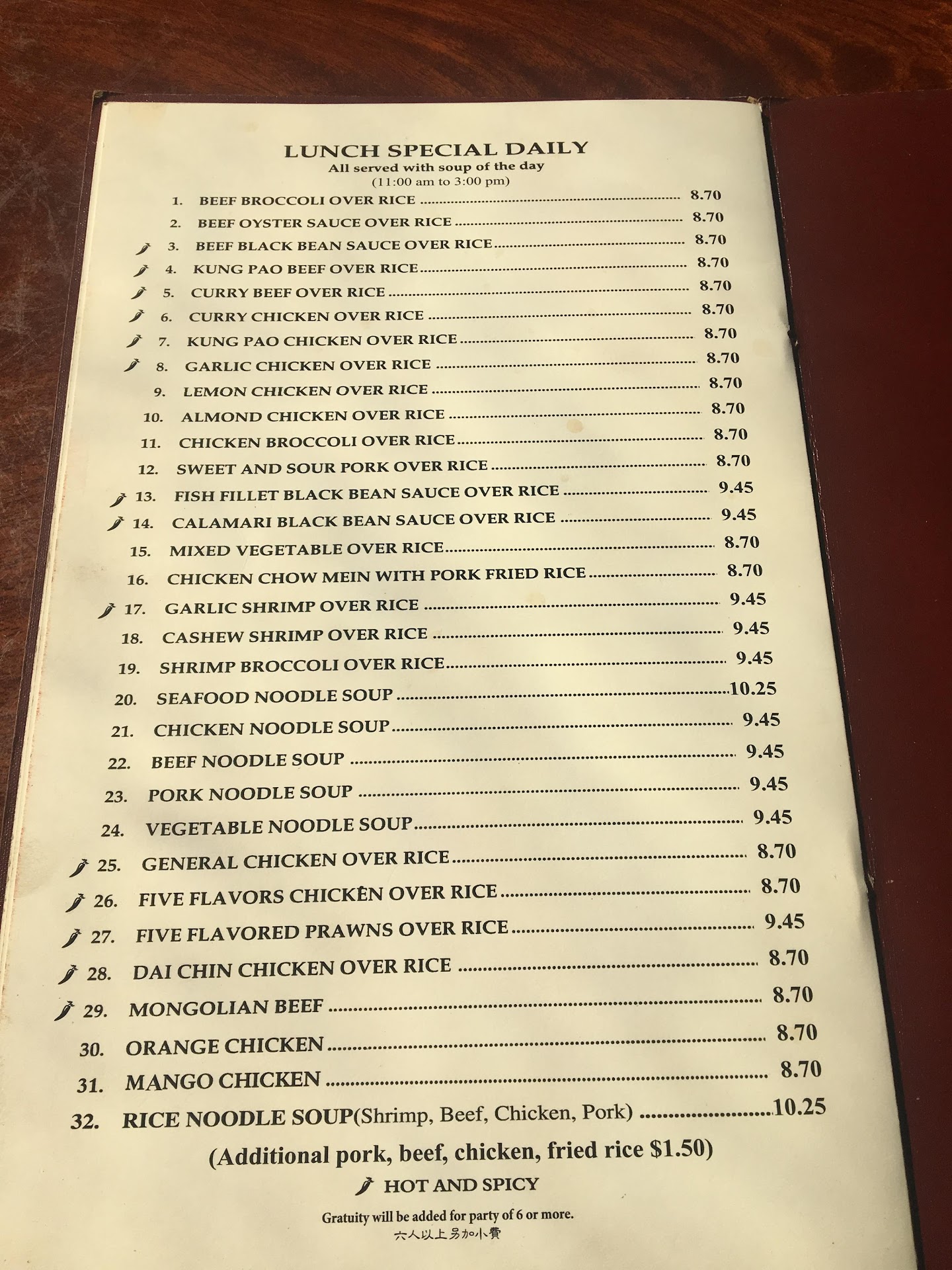 Read moreI freaking love this place. It's a total greasy spoon, but in such a good way. They are so nice in there. The lunch special always come out so fast and piping hot. I love the 5 Flavors Chicken. Super flavorful. Great hot and sour soup too. Family run and everyone chips in seems like. And there's something comforting to me when you go there and hear them screaming in Chinese at each other. And I mean that in a good way. Not screaming mad. Just like, loud. Makes for a palpable and authentic experience. As if you were sitting on a tiny stool in a fragrant alley in Beijing eating something exotic and delicious. Then you realize, you're in Scott's Valley sitting in an old sticky booth looking across at the plumber guy who is also on his lunch break. Fascinating really. So ya, go try the 5 Flavors Chicken. You won't be...