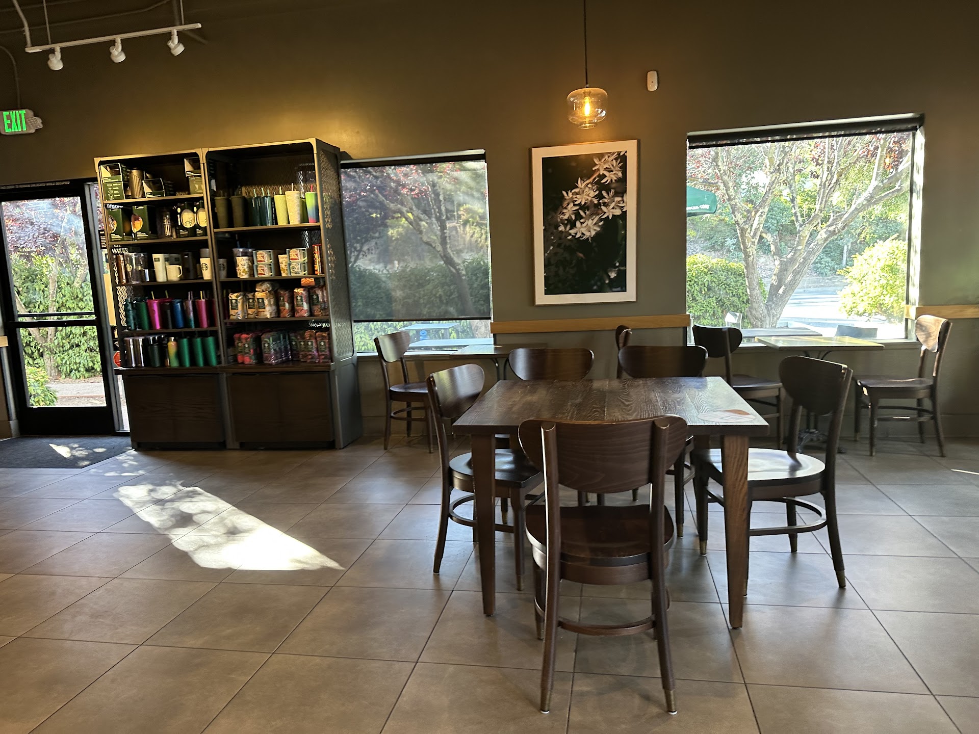 This Starbucks boasts an impeccable cleanliness that's evident in every detail, from the polished countertops to the gleaming espresso machines. Sunlight filters through large windows, casting a warm glow on the spotless wooden floors. The baristas move with a graceful efficiency, their white aprons pristine as they craft your perfect cup.