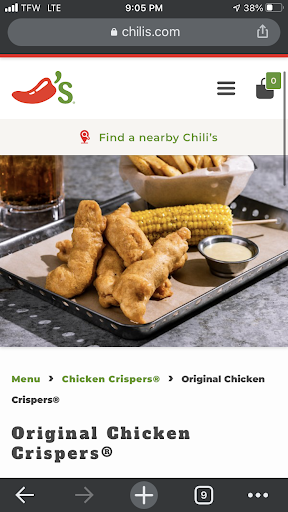We arrived around 8 pm, the restaurant was fairly empty but we were seated right behind the one group of people at the bar, close enough that their chairs hit the table every time the stood up (even though there were many open tables away from there). The table had crumbs on it when we arrived. Our server was also the bartender, he was very prompt and kind, just overworked. It took 45ish minutes to get our two meals when there were maybe 5 tables in the restaurant. All of this was annoying but understandable with short staff. The real issue was the food wasn’t good. We ordered the original chicken crispers- the image from the menu (the one with the corn) shows them as decent sized tenders with plenty of breading. The other image is what we got. They were tiny (probably the size of fajita meat), had practically no breading, and were too dry/tough/overcooked to eat. When the food was brought out and the waiter (not the server who originally served us) asked if everything was okay we said the chicken crispers were not right and she said ‘so everything’s okay then?’ And left. We complained to our original server and he offered to get an order of crispy chicken strips. That wasn’t what we wanted but there really wasn’t any other option. The manager (?) brought out a tray with both kinds of chicken strips and condescendingly explained the difference (she got down on a knee next to the table like we were kindergartners she needed to CCD all down or something). I know that she may not have intended to be rude but she still came across that way. The chicken crispers were slightly better, at least almost crispy and not as dry, but still not right. The point of all of this is that they aren’t making the food correctly (food that at other chili’s restaurants is like the picture in the menu), we gave them a chance to fix it and some of the staff was...