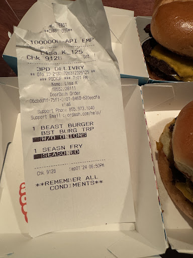 The fries were burnt, cooked in old grease, and tasted terrible. The burgers were old, dried out, and tasted like they were cooked on a grill that was never scraped off or cleaned. Plus, they were supposed to have onions, ketchup, mustard and pickles on them. Only had mayonnaise. Paid 46$ and it tasted like they dug overcooked food outta the McDonald's dumpster and reheated it to serve. Wouldn't be surprised if I ended up sick to my stomach even though I could barely choke...