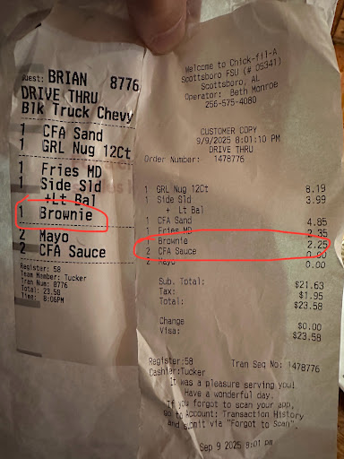 Read moreThanks for leaving the Brownie I paid $2.25 for out my bag tonight. Is it really that hard to do? It’s CFA, I expect better. There wasn’t even anyone behind me in line, was it too much to ask for someone to check it before it got walked out the door? This kind of stuff use to never happen, and if it ever did someone was going hear about it and usually make it right, but today, this is just common place, happens all the time, nobody thinks twice about it anymore, and these places are full of younger kids and young adults, so what are we teaching these people now, really, what are we? I see this as a problem that’s not getting better but rather worse with time, that carries over into other jobs and places as time goes on, and if it’s not corrected at some point, then what? What does the next generation become? I understand that people make mistakes, but why does this kind of stuff keep happening over and over again across many different restaurants including the ones you least expect it from? Ok, so it’s $2.25, big deal right, well it’s not about the money to me, it’s about a much bigger problem. Let me simplify this, per my photo, I see not one but two check lists here, but yet something was still missed, a task that should be easily completed by a elementary age student, but we have juniors and seniors, early college age people working here, that can’t follow a simple check list? The worrying thing to all this is, CFA, or any other restaurant shouldn’t be the ones teaching these people how to follow a simple check list, this should be well learned by the time they can get a job there so, where in all of this does the problem exist and when are we going to...