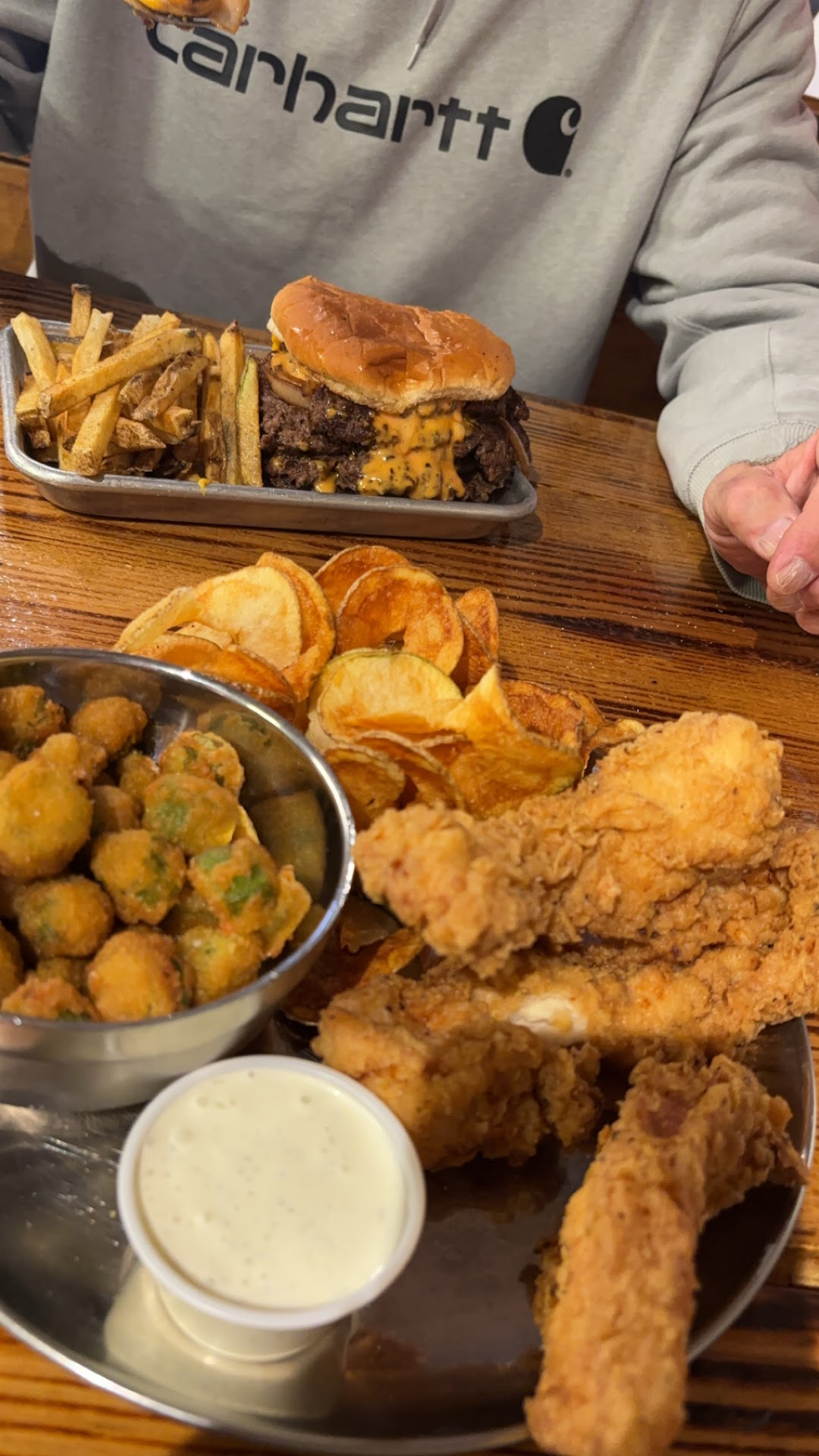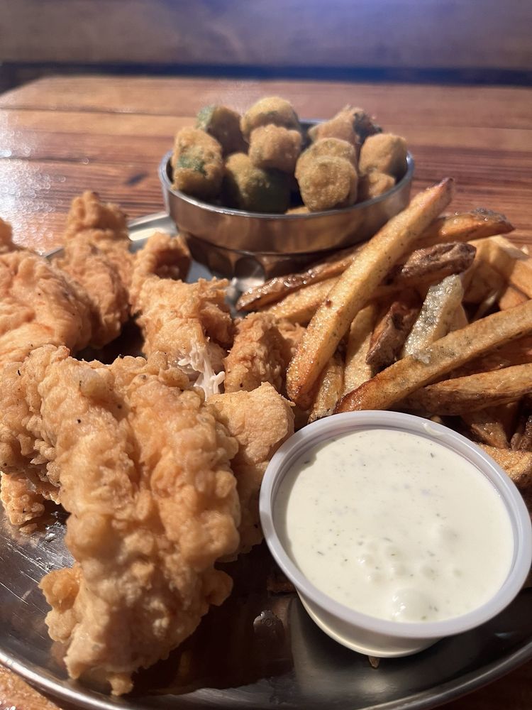 The food was fine! The tenders were cooked nicely and were HUGE! The portions were quite generous and I was able to take some home. The batter had a sort of fish-fry batter flavor to it, which is fine but not my favorite on chicken. The okra was probably the best thing. Not over breaded, very crispy, still tender and green and snappy on the inside. I also enjoyed the clearly house made ranch. Perfect for tenders, fries, and even a piece of okra or two...hehe.