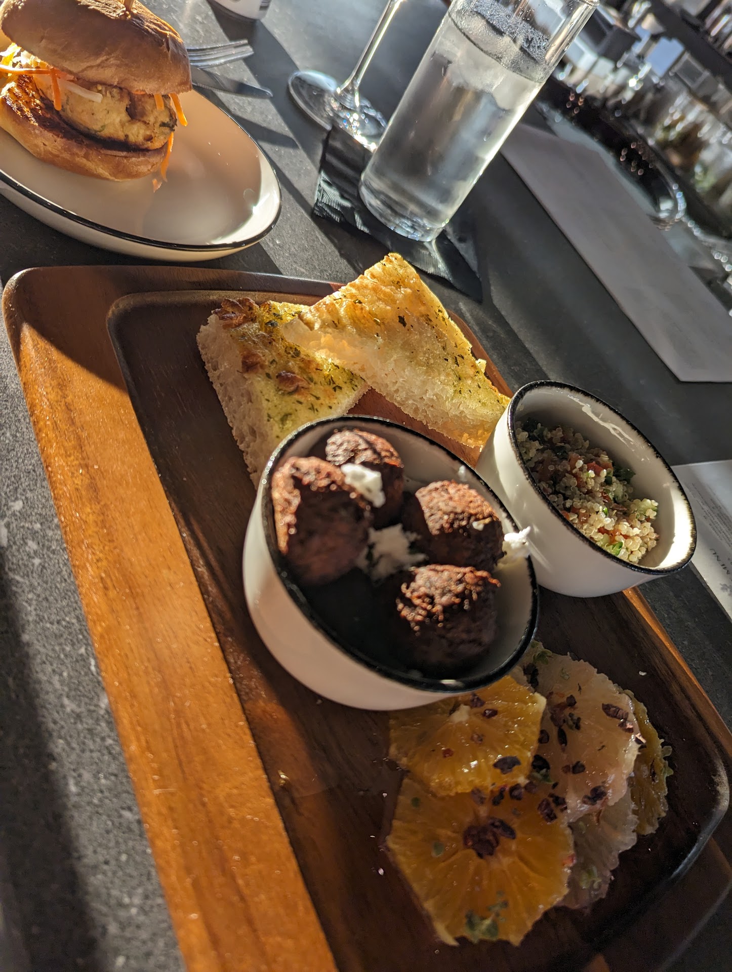 Once we were seated, we were informed we had to order off the dinner menu. Not a problem but the dinner menu itself has no vegetarian options, where the lunch menu did. When I asked what the server what I could eat, she suggested veggies and hummus or a soft pretzel. I like both, but they're appetizers, not a meal. (And not even an appetizer you could pass as a meal.) A few moments later, she also suggested the burger, which they could sub for a quinoa patty. There is a small note on the menu that this is a vegetarian option. Please note that if you are vegetarian or vegan, this is the ONLY option for you on the dinner menu.