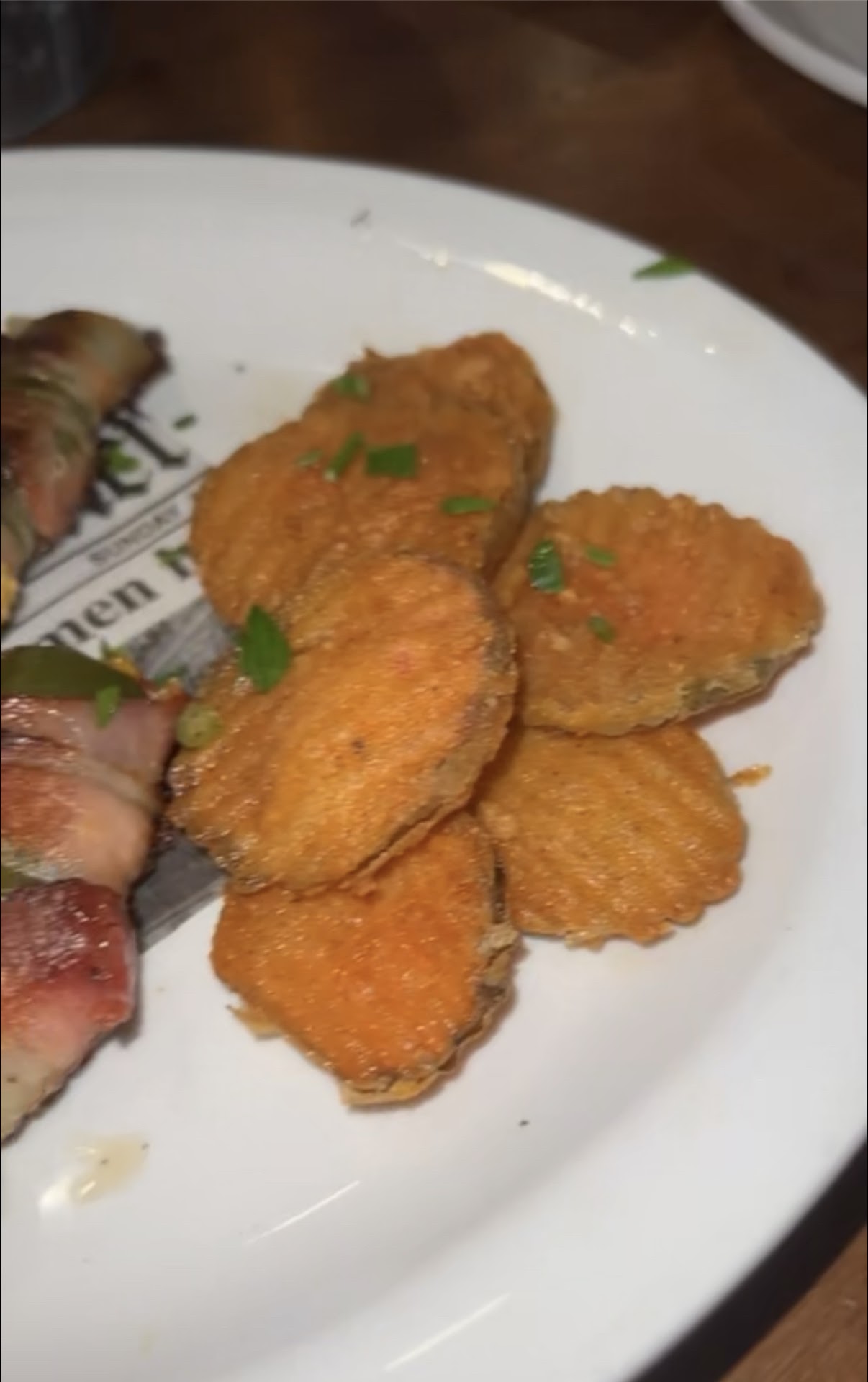 Now to the food, we ordered our appetizer to see if we would like to eat our lunch here after driving all day. So we got the “Best of Belle’s” which we got fairly quick. For the price amount of $18 you will receive about 7 pickle chips, 3 devil’s on horseback, and 2 Nashville Hot chicken fingers. In my opinion, this is definitely not worth this price, definitely should be dropped down to around $12.