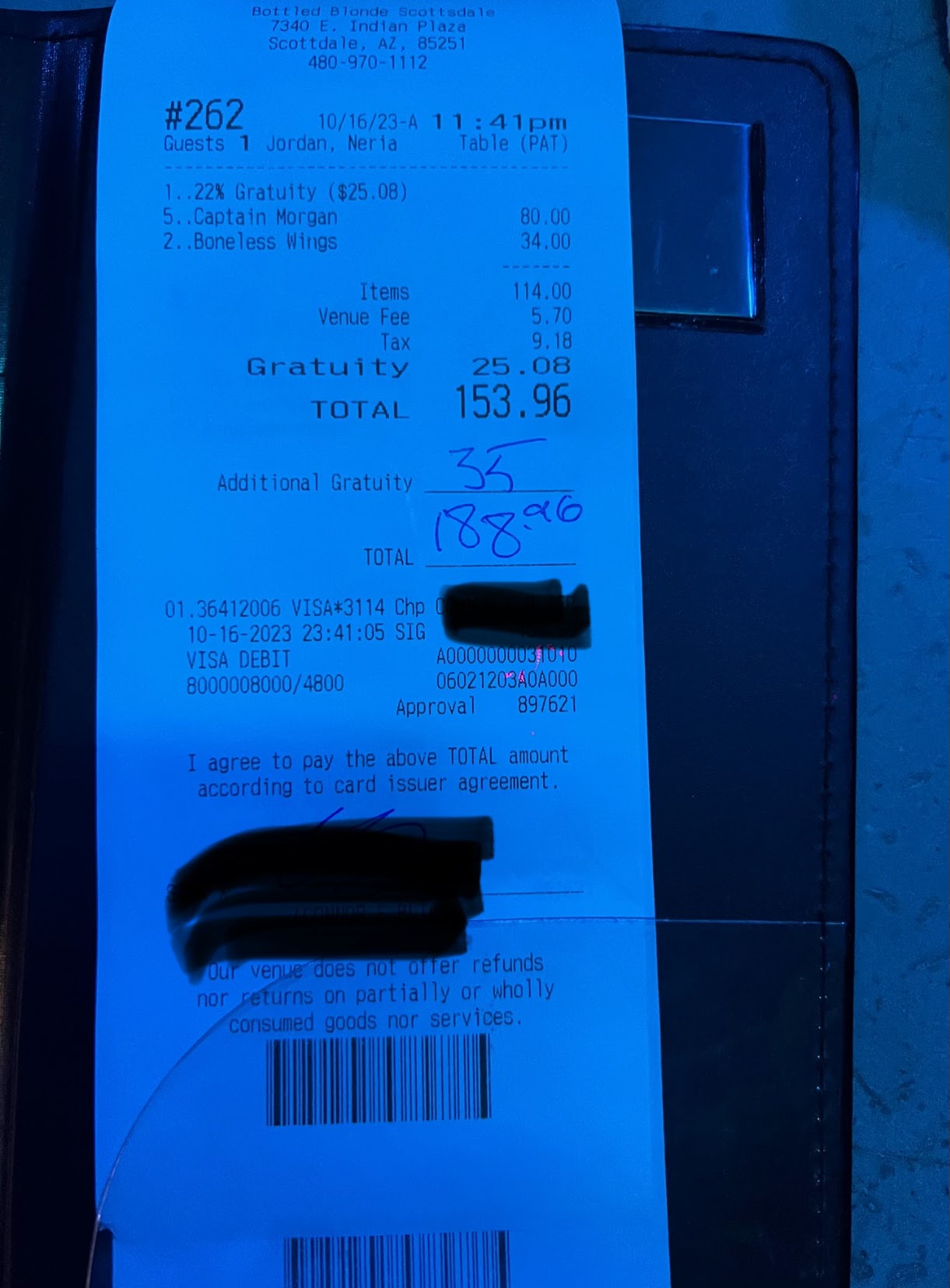 He was fairly aggressive and rude, but understanding his frustrations - as a customer, mind you - I remained calm. Even when I asked to take a picture of my own card while leaving so I could call the bank in the AM, after voluntarily letting him keep the contents of my wallet, he refused to give me my own property. Which Iām fairly sure is illegal. He made me take the picture from a distance, which was frankly embarrassing. He then proceeded to make a public scene of this exchange with the rest of the bar, security and host staff - improperly showing them how to treat a customer.