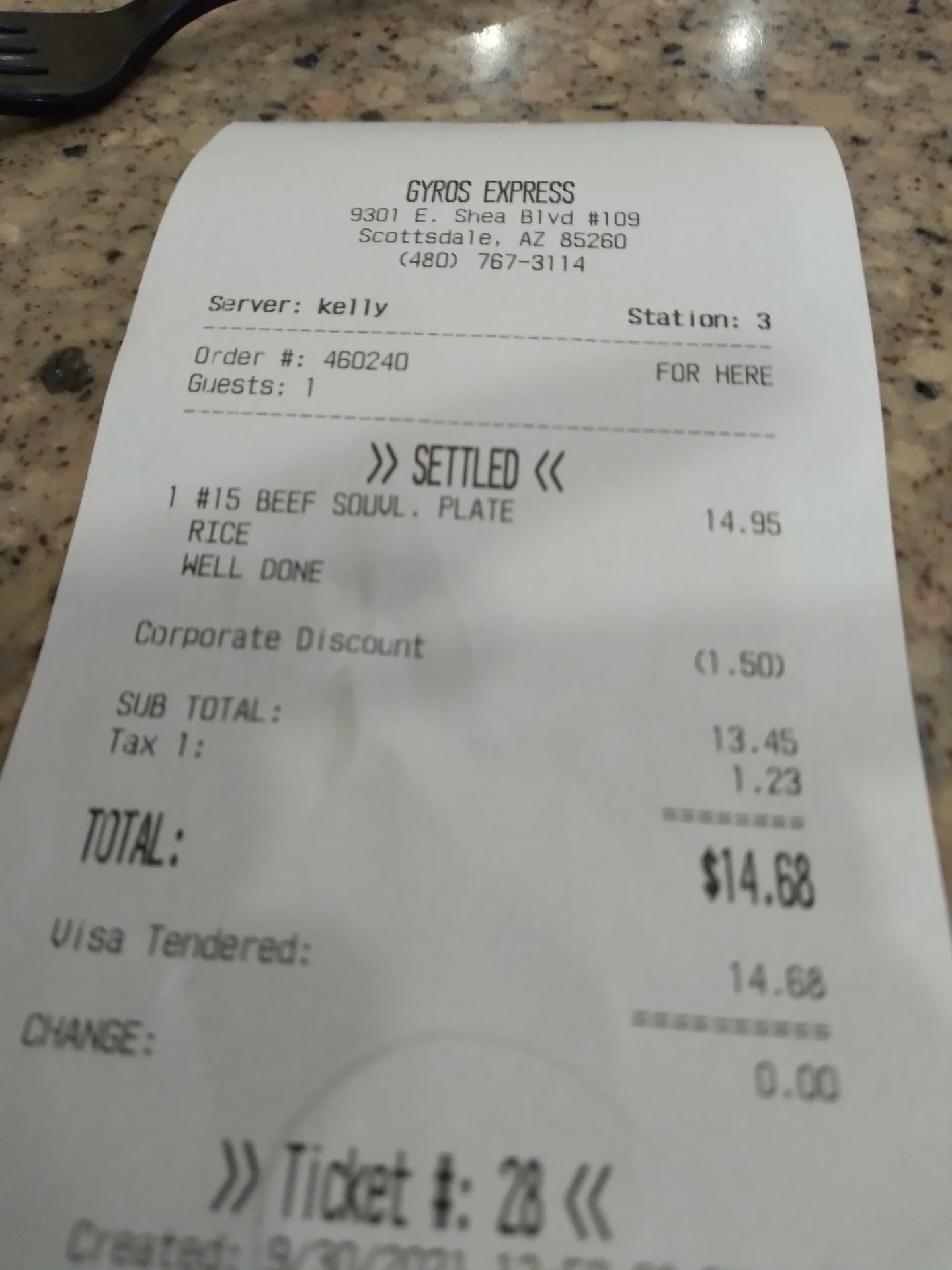 Read moreThe food was great, it was the first gyro i I had in Phoenix that wasn't dry and somehow greasy at the same time. Nooo this gyro was flavorful, it reminded me to the döner kebab i used to get in Wolfsburg,it came with some tzatziki, I add some tapenade and OMG... I also got the beef plate, that was great, the portion was enough for lunch and dinner. The Tabouli was full of flavor with kalamata olives. I'll definitely recommend the food and the service and will be visiting more often even if its a ...