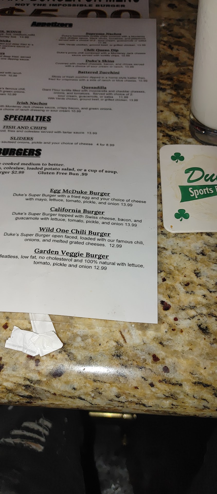 My friend and I go to Dukes alot....we try to go on Mondays and Wednesday for their burger and salad special. The last time we went on Monday...they said that it was the last night of the $5 burger special and then it would go back to the regular special which was $6.99. We asked the server if the burger special was effective and he(Trevor) stated yes. We ordered our burgers and ice tea...my girlfriend asked for a refill and they said that would cost a dollar. So long story short..when I got the bill for two burgers and two ice teas with a refill ...the bill was almost $40. When I question the bill he stated that the burgers that we ordered was full price...when I asked why he did not tell me that when I asked...he said sorry about that ...its only the super burger...Nice to have known before we ordered. I asked to speak to the manager and he adjusted the price of one burger and when I asked why he said that the other burger was considered a sandwich.That to me made on sense as they had always treated it as regular burger. I asked to speak to the manager and he basically said too bad...I should have read the menu. The server should know his specials................NEEDLESS TO SAY ...I WILL NEVER TO BACK!!!!!!!!! HORRIBLE...