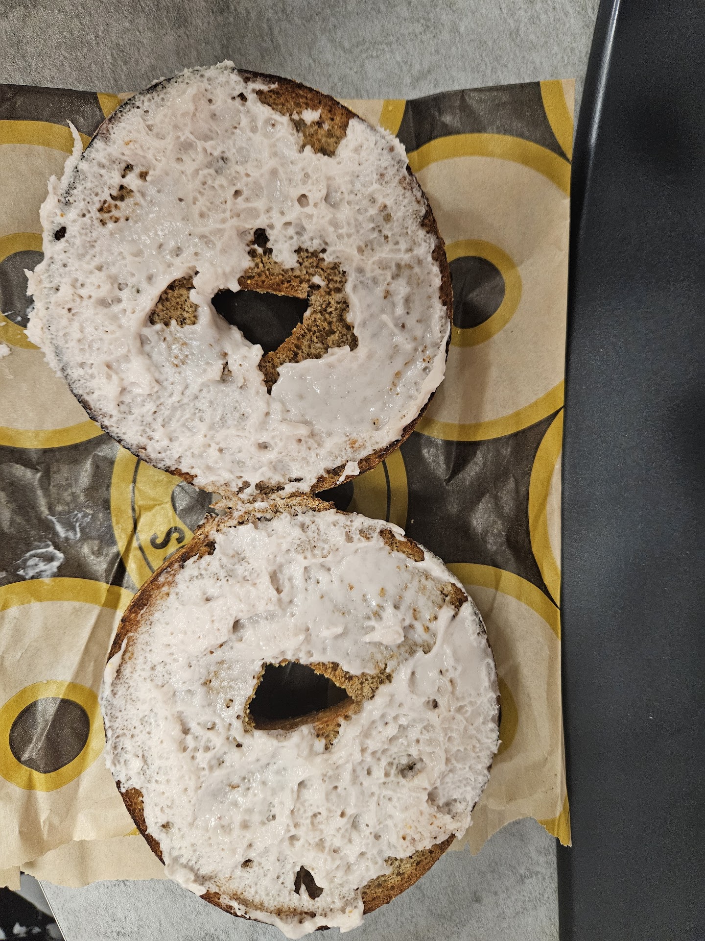 Read moreThis was quite possibly the dumbest situation...and person. $11.99 gets you 6 bagels plus a cream cheese tub. I ordered and asked if they would please toast 3 of the bagels. She said with a straight face, "I can't, its against company policy?"