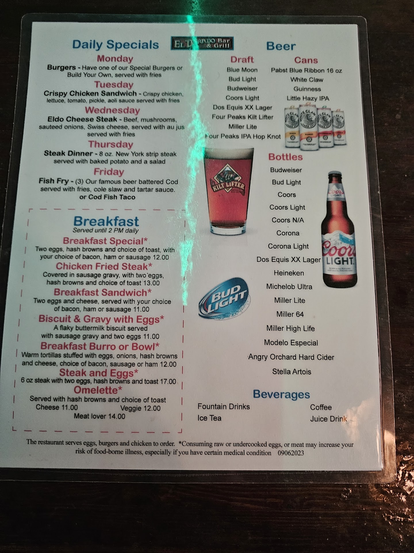 Read moreMust Read I love this bar. Recently under new ownership, so it's more clean than it used to be. Food is bomb, give it a try. They service breakfast until 2pm. They have a green chili burger that is killer for lunch or dinner! Great Happy hour prices until 6pm. Awesome food prices overall, but they do a daily deal. Mondays are $5 build-a-burger with all the toppings at no extra charge. They have a pool table inside and a stage. Previous owners used to do live music and karaoke, not too sure anymore. There is a back patio that is purely for smokers. I don't mind it, it's got history of being that type of patio, and I know that some locals look for that. Its dark in the place most often (but that is one of my favorite features with kind of that dive bar style). I wouldn't bring my kids here, personally. Plus it's a good place for adults to wind down...