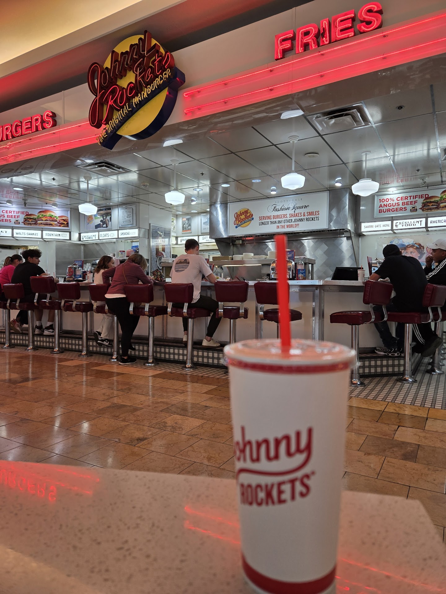 Read moreToday I drove all the way to Scottsdale to visit Johnny Rockets. When I arrived, the waitress offered me a menu. I told her I knew what I wanted. She told me to Wait. I said take your time. After a while, she completed cleaning up after a party that had left. She couldâve easily taken my order and submitted it and then completed the cleanup. I sat where I could watch my order being processed.. It was nerve-racking as the ingredients were spread all over the counter where the cook was working.. The staff was having a nice chat and finally one of them noticed that my order had been sitting there for some time. It was very frustrating to me to watch him at the opposite end of the work area to wander around, offering my hamburger to others who refused it. He then asked the waitress who it should go to, and she pointed in my direction. Meanwhile, my wife had gone to chipotle ordered her meal, brought it back and ate in front of me while I was still waiting on my hamburger, which when I got, it was as cold as a fish. No more Johnny rockets for me...